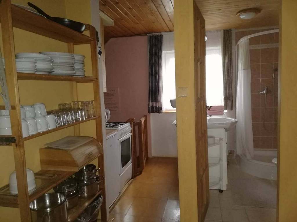 v patře pak kuchyňka na vaření, pečení. S MYČKOU. DOSTATEK NÁDOBÍ