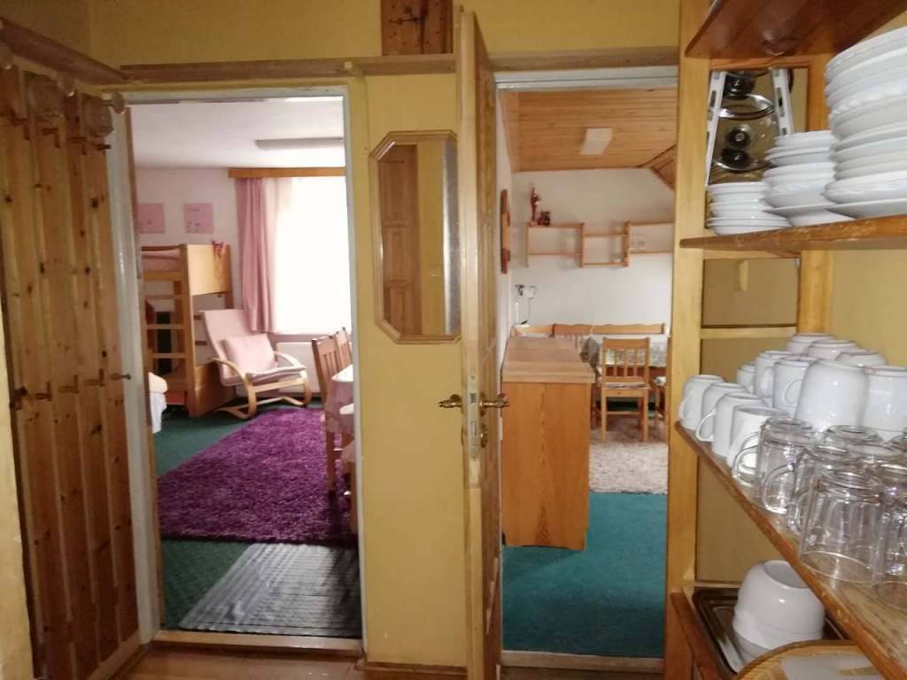 Kuchyňky jsou malé ale vybavení je bohaté. V přízemí u krbu je studená kuchyňka,