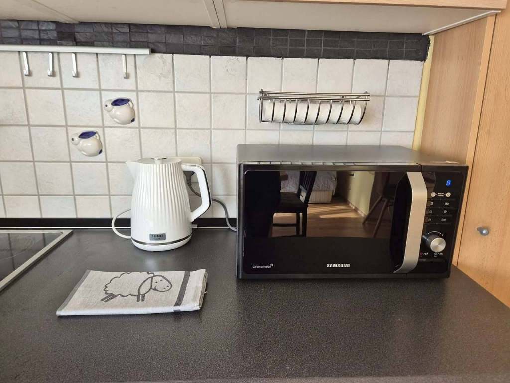 Vybavená kuchyňka v apartmánu: varná deska s 2 plotýnkami, mikrovlnná trouba, lednice, kávovar Nespresso včetně kapslí.