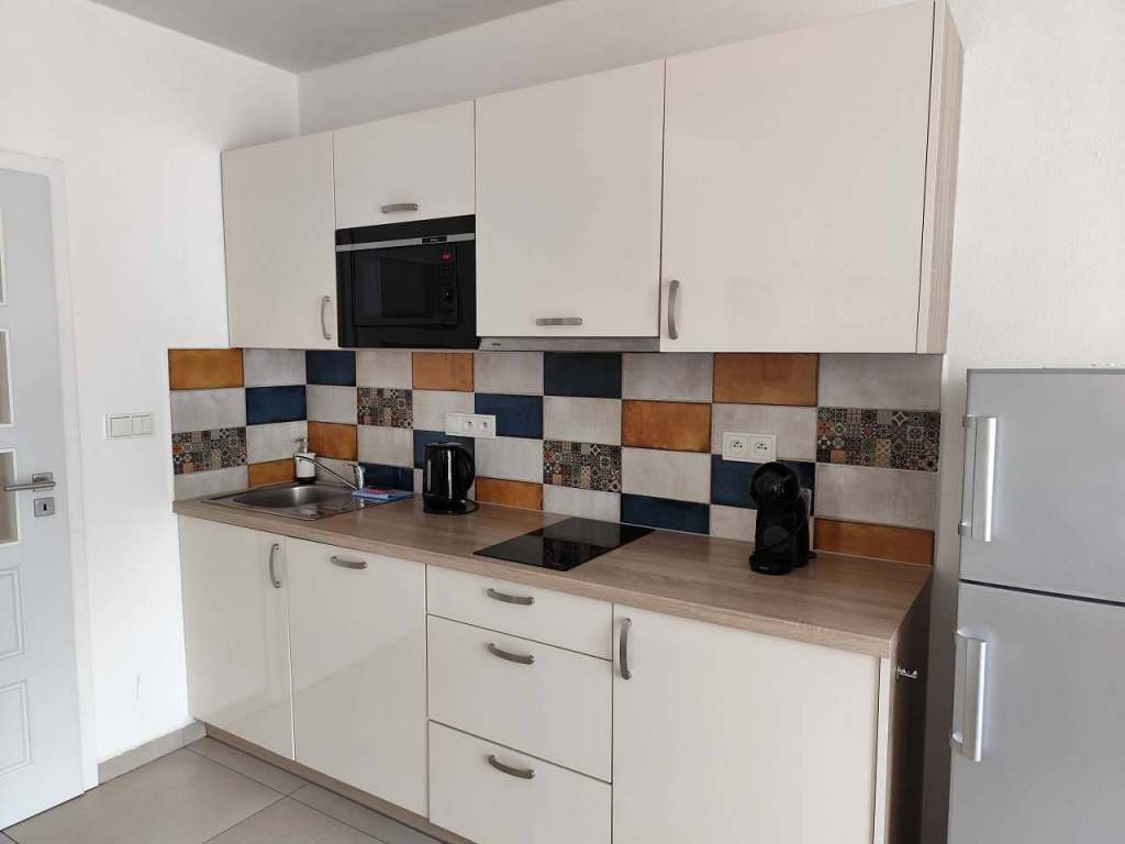 Kuchyně s myčkou nádobí, mikrovlnou troubou, varnou deskou, lednicí s mrazákem, rychlovarnou konvicí, kávovarem na kapsle. V jídelní části je velký jídelní stůl se šesti židlemi. Na terase venkovní posezení pro 6 osob, slunečník, sušák a elektrický gril. Pod terasou je Vám k dispozici uzamykatelná kóje na úschovu kol.