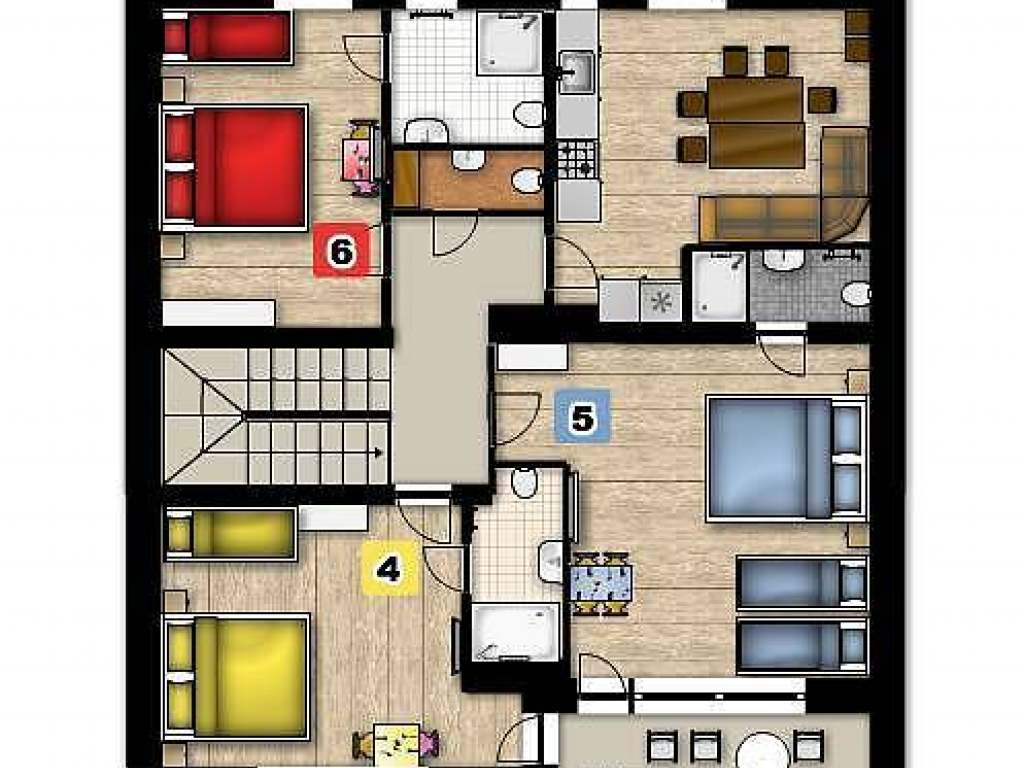Jedná se o podkrovní byt na druhém patře, oddělený od zbytku domu uzamykatelným vchodem. S majiteli je společný vstup do domu a schodiště. V bytě se nachází 3 zcela samostatné ložnice (každá s vlastní koupelnou) a plně vybavená kuchyně s jídelnou. Dva pokoje jsou čtyřlůžkové s balkonem a jeden je dvoulůžkový bez balkonu, každý pokoj má vlastní koupelnu WC, na patře je opět jídelna se skvěle vybaveným kuchyňským koutem, dimenzovaná na maximálně 8 osob. Na spodním patře je zázemí - předsíň, hala, WC, sušárna bot a dětský koutek. Lyže a kočárky lze uschovat v hale nebo v garáži.