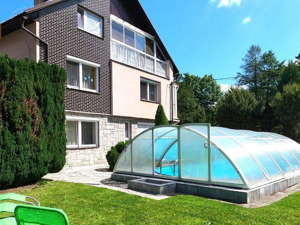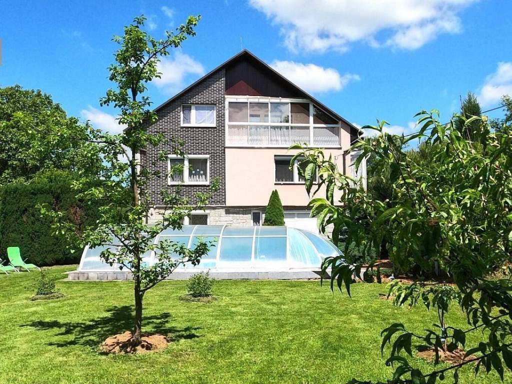 Venkovní vybavení: zastřešený bazén (velikost 4x8m, hluboký 150cm), lehátka u bazénu, velká trampolína, houpačky, prolézačky a pískoviště pro děti, venkovní posezení s grilem (brikety a dřevo není součásti grilovací sestavy).