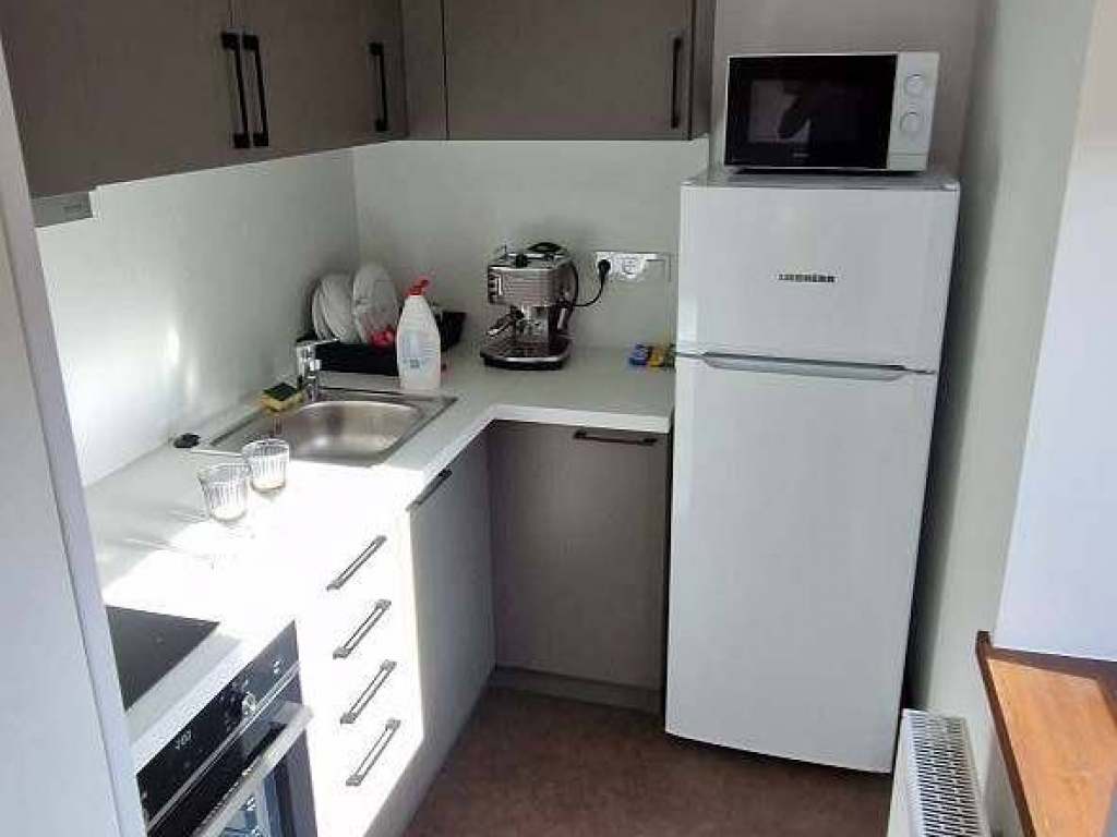 Hlavní místnost s vyklápěcí postelí, rozkládacím gaučem (obojí 140×200cm) a jídelním stolem, lehce oddělená kuchyň (bez dveří).