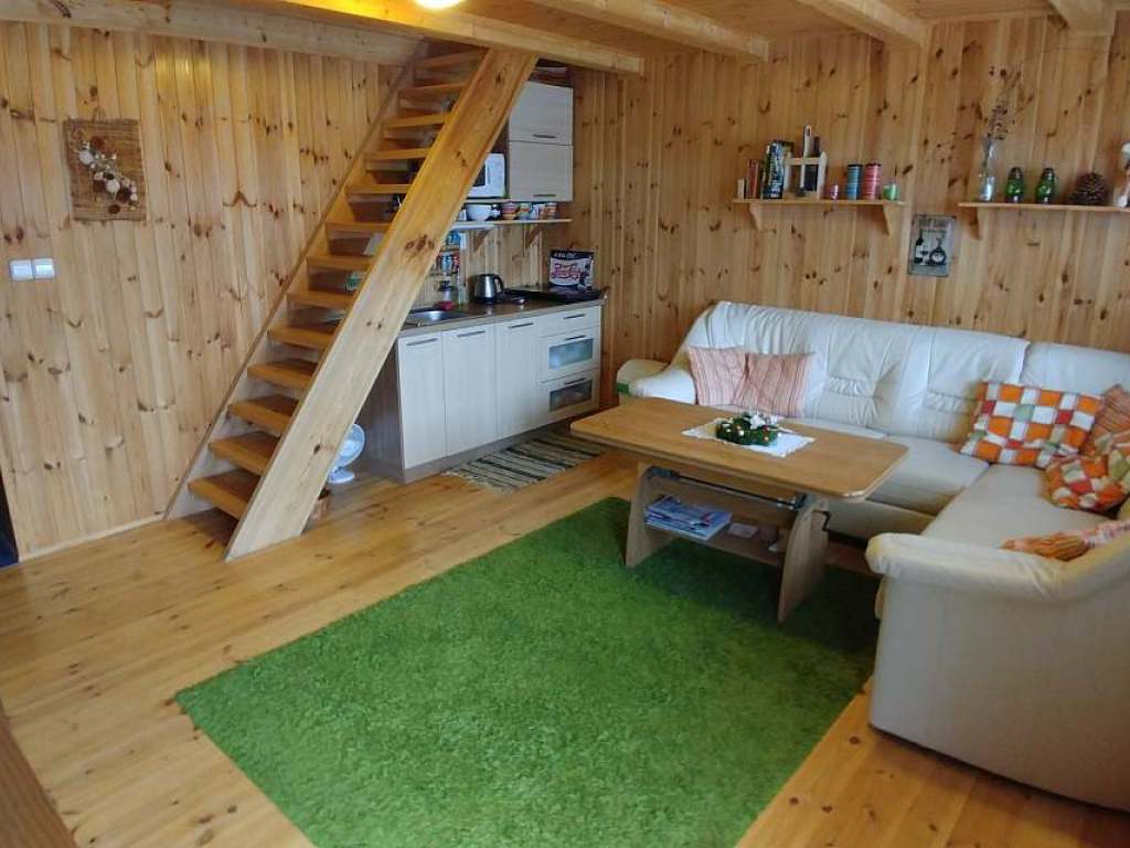 Ložnice v podkroví se čtyřmi lůžky, dvě přistýlky v obývacím pokoji (rozkládací gauč).