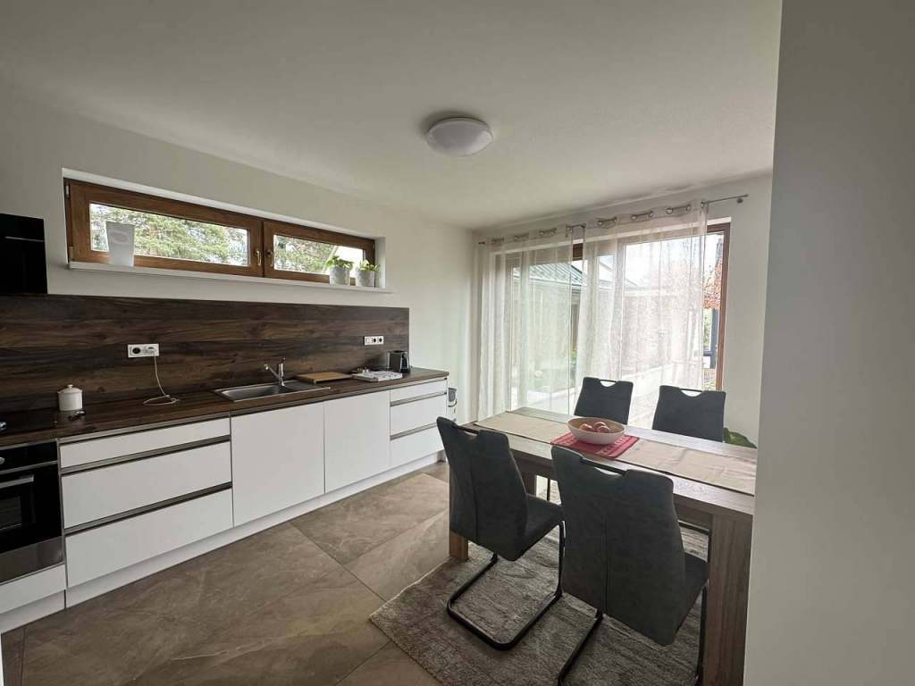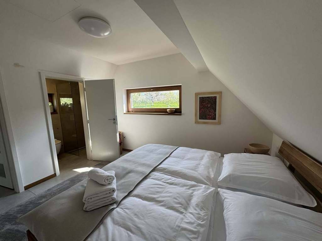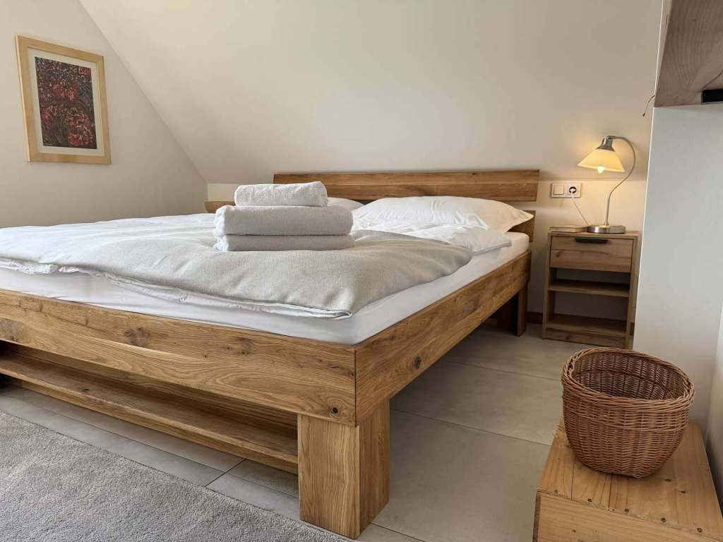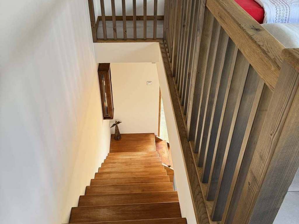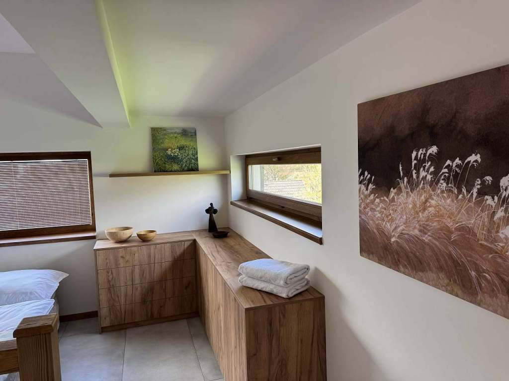 V přízemí apartmánu je prostorná plně vybavená kuchyň a obývací pokoj s TV, vestavnou skříní, rozkládací sedačkou. Při vstupu je technická místnost kde je umístěn plynový kotel a WC. V podkroví se nachází dvě samostatné ložnice s kapacitou 4+1.Možnost jak navýšit kapacitu je využití rozkládací sedačky v obývacím pokoji. Koupelna s WC a sprchovým koutem se nachází v podkroví.