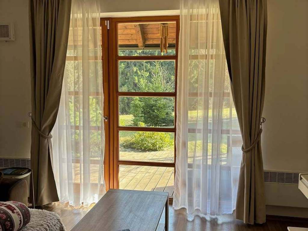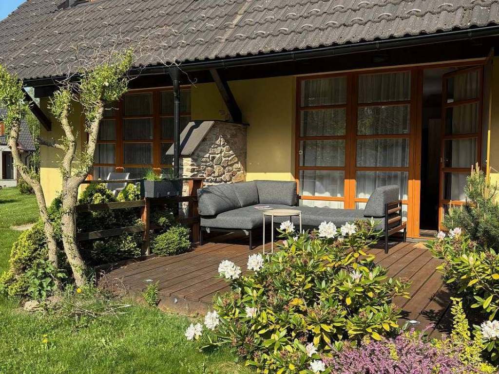 Součástí apartmánu je hlavní obytná místnost s francouzským oknem a vstupem na terasu. Je zde útulná vestavba na spaní, kuchyňský kout a jídelní kout. Na chodbě jsou prostorné vestavěné skříně. Součástí je koupelna, WC, předsíň, komora a částečně krytá terasa. Z terasy je vstup přímo na louku a do 100m vzdáleného lesa.