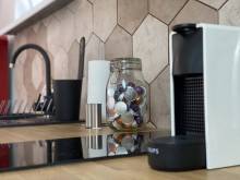moderní velká LCD televize, kávovar, základní vybavení kuchyně.