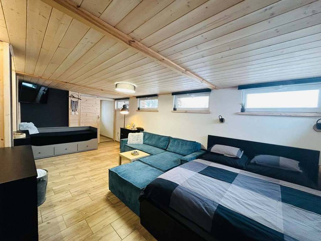 Tento pohodlný apartmán nabízí vše, co potřebujete pro příjemný pobyt. Je vybaven manželskou postelí (160x200 cm) a rozkládací postelí s dvěma plnohodnotnými lůžky (80x200 cm), což zajišťuje komfortní spaní pro rodiny nebo skupiny přátel. K dispozici je také pohodlný gauč pro relaxaci po dni stráveném v přírodě. Apartmán je vybaven televizí pro volný čas a samozřejmostí je i WiFi připojení zdarma, které vám umožní zůstat ve spojení s okolním světem.