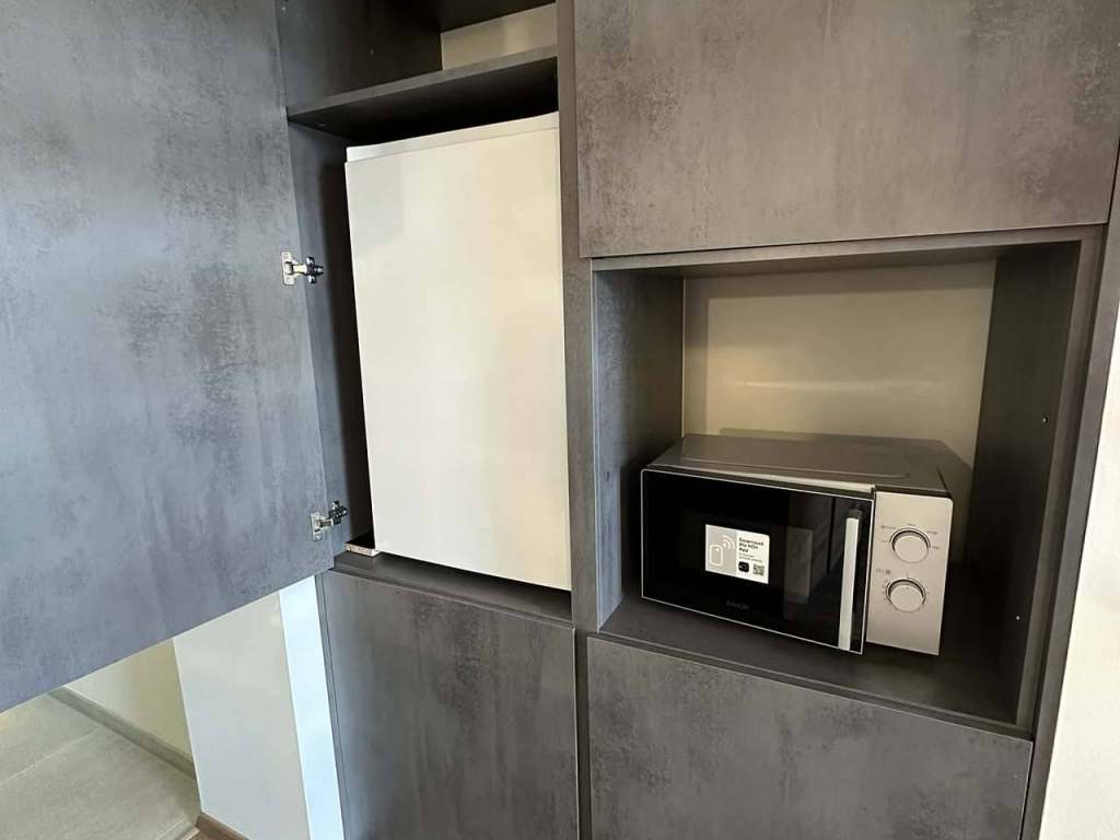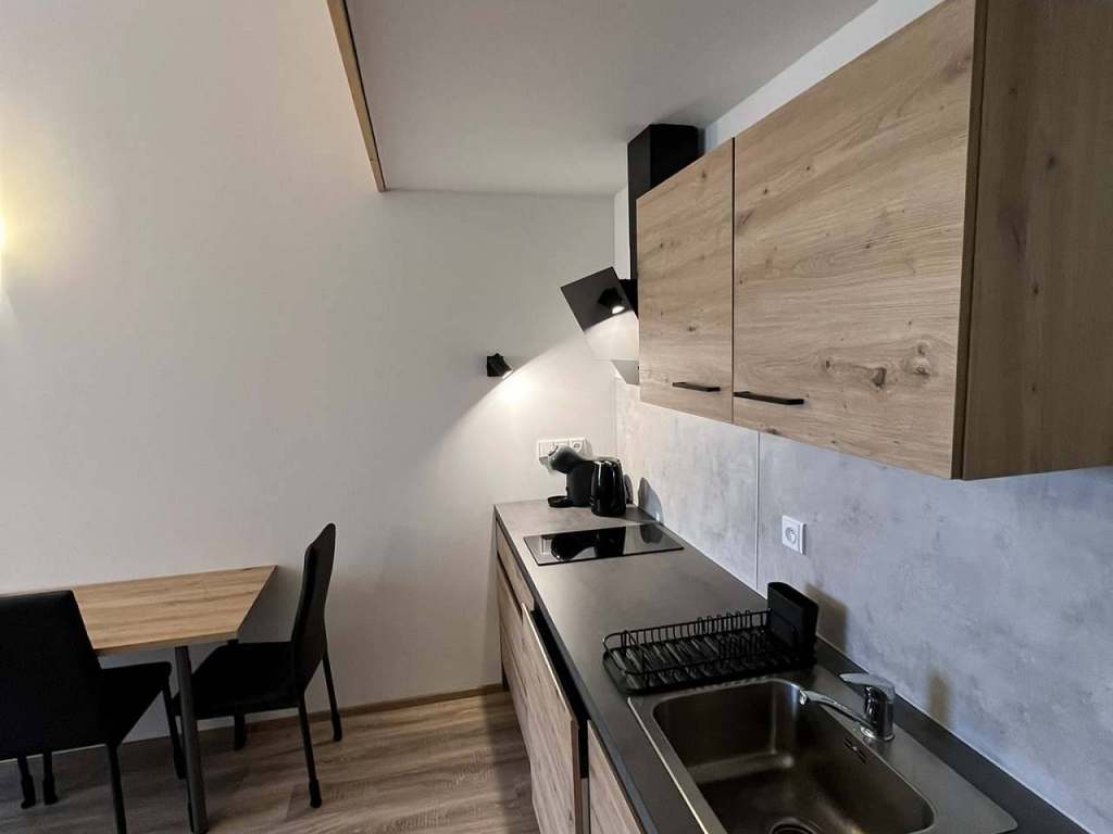 Plně vybavená kuchyně s lednicí, myčkou, indukční varnou deskou, mikrovlnou troubou, varnou konvicí a kapslovým kávovarem Dolce gusto.