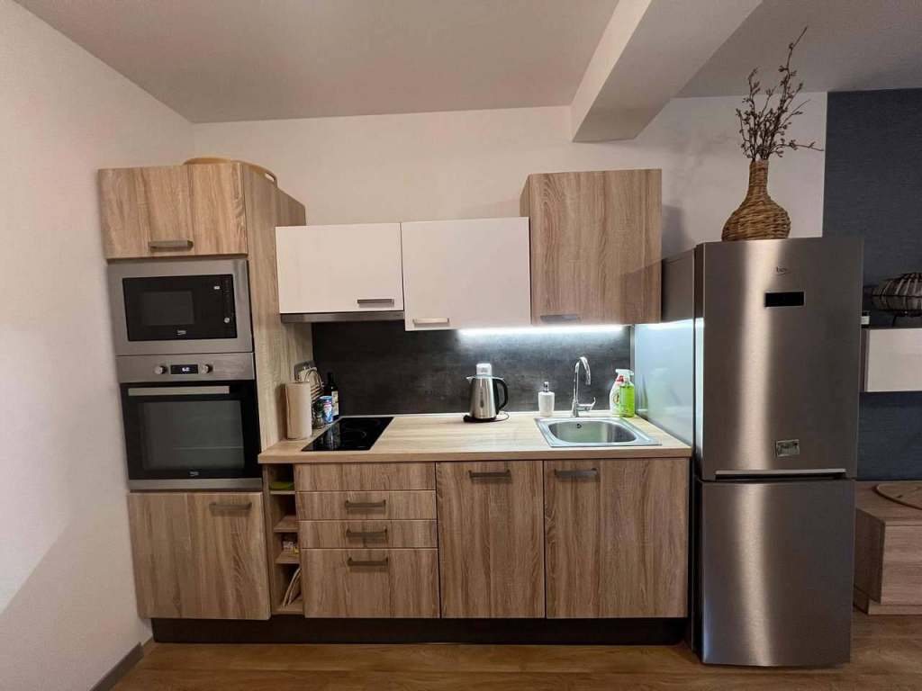 Plně vybavený kuchyňský kout: myčka + kapsle do myčky, sklo keramická varná deska s odsáváním, horkovzdušná elektrická trouba, mikrovlnná trouba, rychlovarná konvice, toustovač, kávovar na kapsle - Nescafé Dolce Gusto, prostorná lednice s mrazákem, kuchyňské potřeby, nádobí, houbička a prostředek na mytí nádobí, utěrka.
