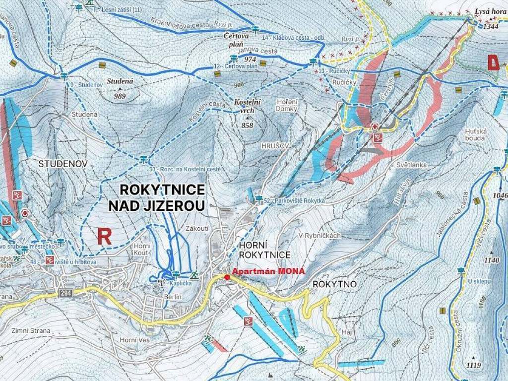 Nabízíme k pronájmu útulný apartmán Mona, který se nachází v horském městečku Rokytnice nad Jizerou v malebném údolí obklopeném horami. Poloha - přímo u sjezdovek. Skiareál Nahoru Resort Rokytnice se nachází jen pár minut od ubytování (zastávka skibusu 50m od apartmánu). Lyžařský areál Modrá Hvězda je vzdálen 300m (na svahu za domem).