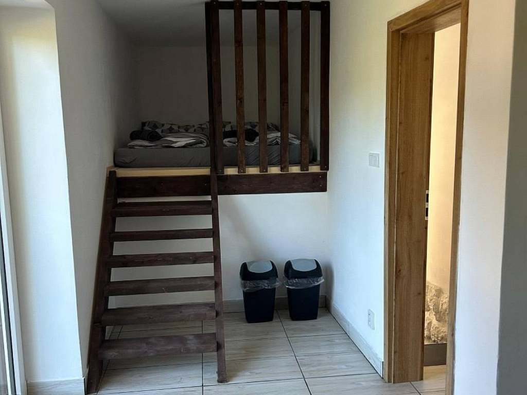 Ložnice 3: Součást kuchyně, dvoulůžko na vyvýšeném pódiu.
