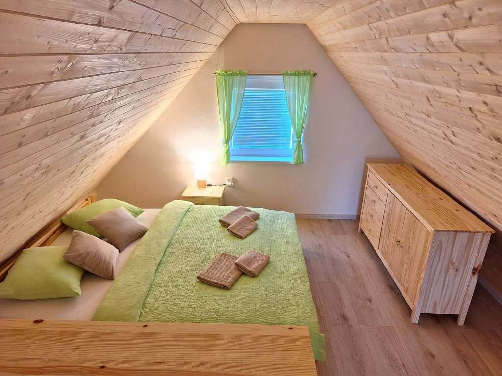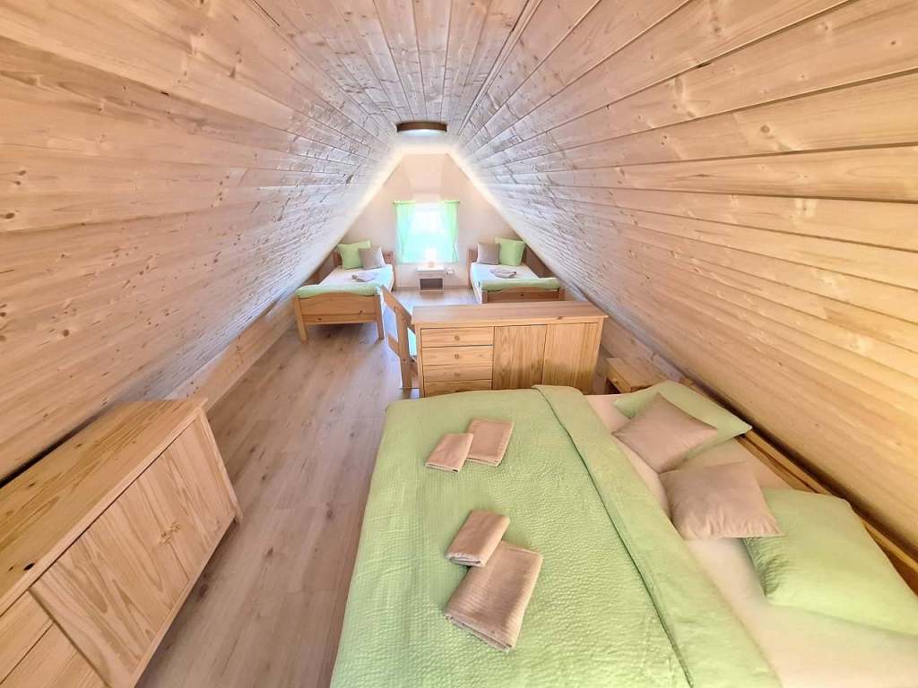 V přízemí kuchyně (mikrovlnná trouba, el. vařič, lednice s mrazákem, rychlovarná konvice, kávovar, nádobí) a obývací pokoj s televizí. V podkroví manželská postel a dvě samostatná lůžka, úložný prostor a v obývacím pokoji rozkládací pohovka. Krytá terasa, venkovní posezení u sklípku, gril, kolárna.