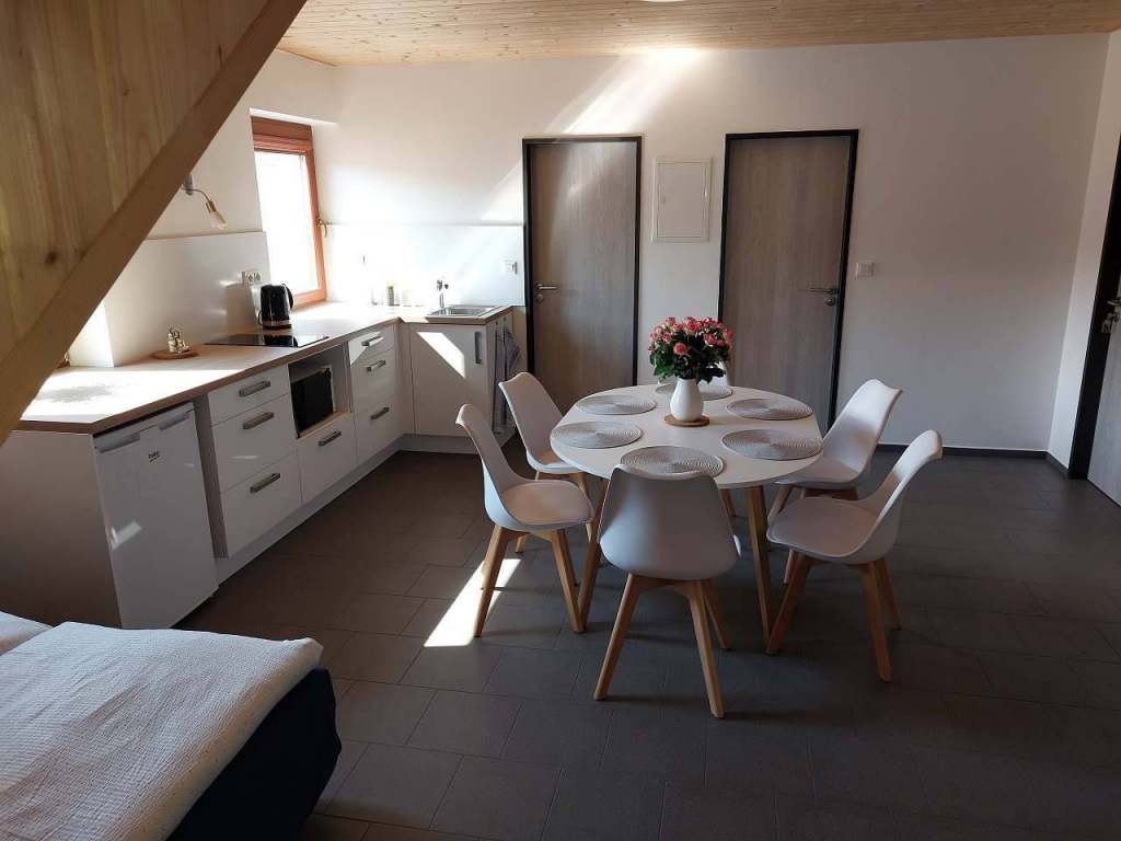 V kuchyni se nachází základní vybavení včetně indukční varné desky, mikrovlnné trouby, varné konvice, ledničky a malé vinotéky.