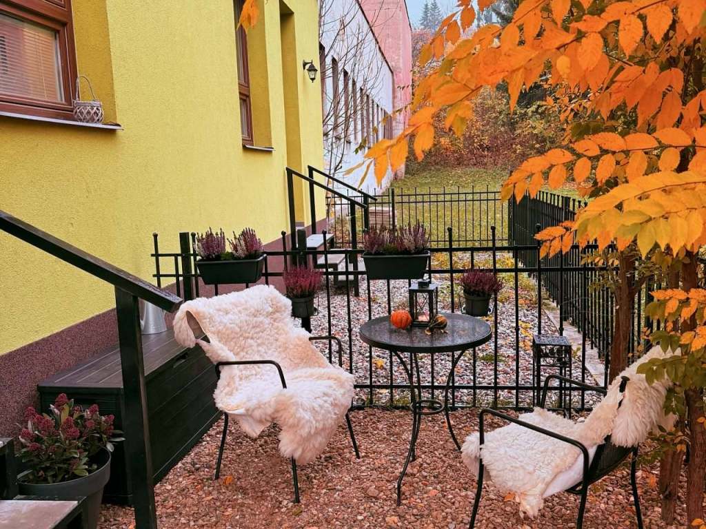 Součástí je i soukromá zahrada, zastřešená pergola, vlastní parkovací místo a prostor, kde si můžete bezpečně uložit věci, jako jsou kola či lyže.