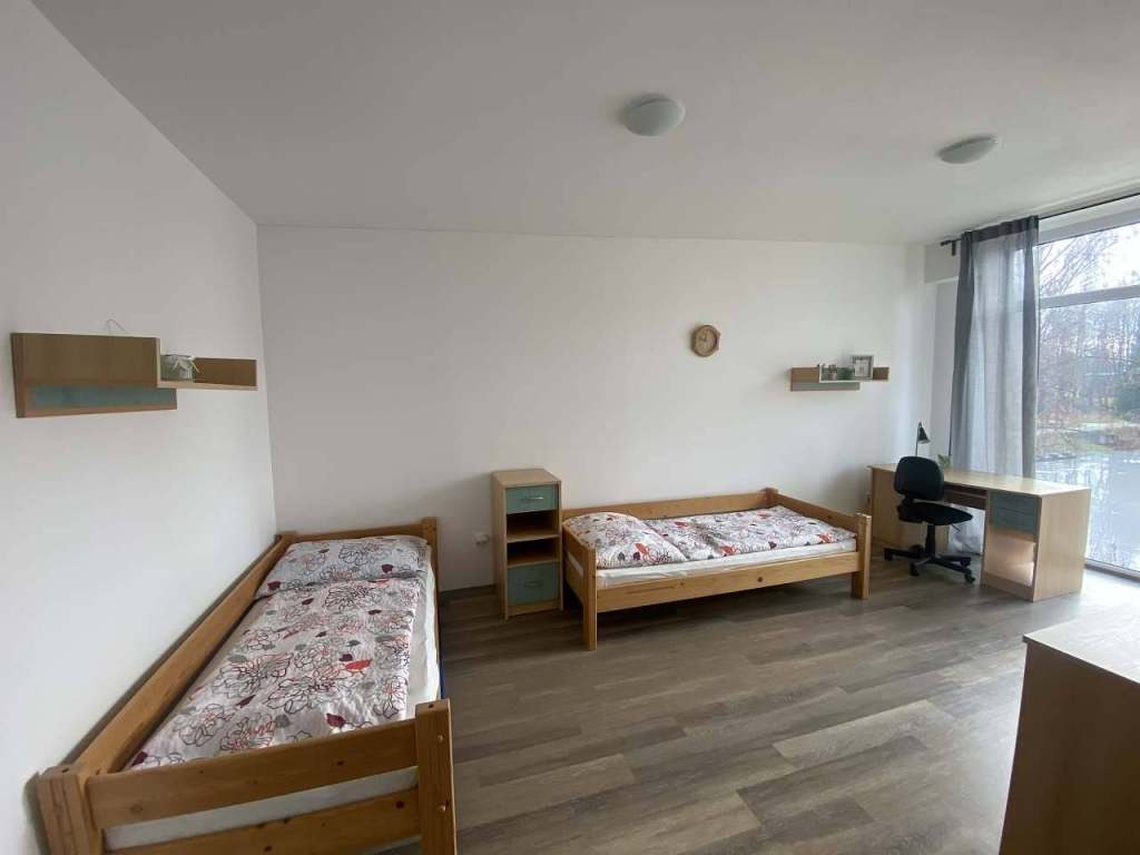 V pokojích se nachází postele s povlečením, úložné prostory, pracovní stůl a židle.