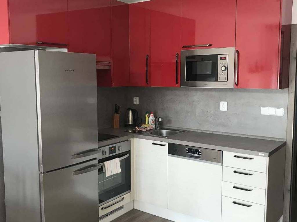 Plně vybavená kuchyně s troubou, indukční varnou deskou, myčkou, mikrovlnou troubou, lednicí, digestoří a varnou konvicí. Součástí je i jídelní kout.
