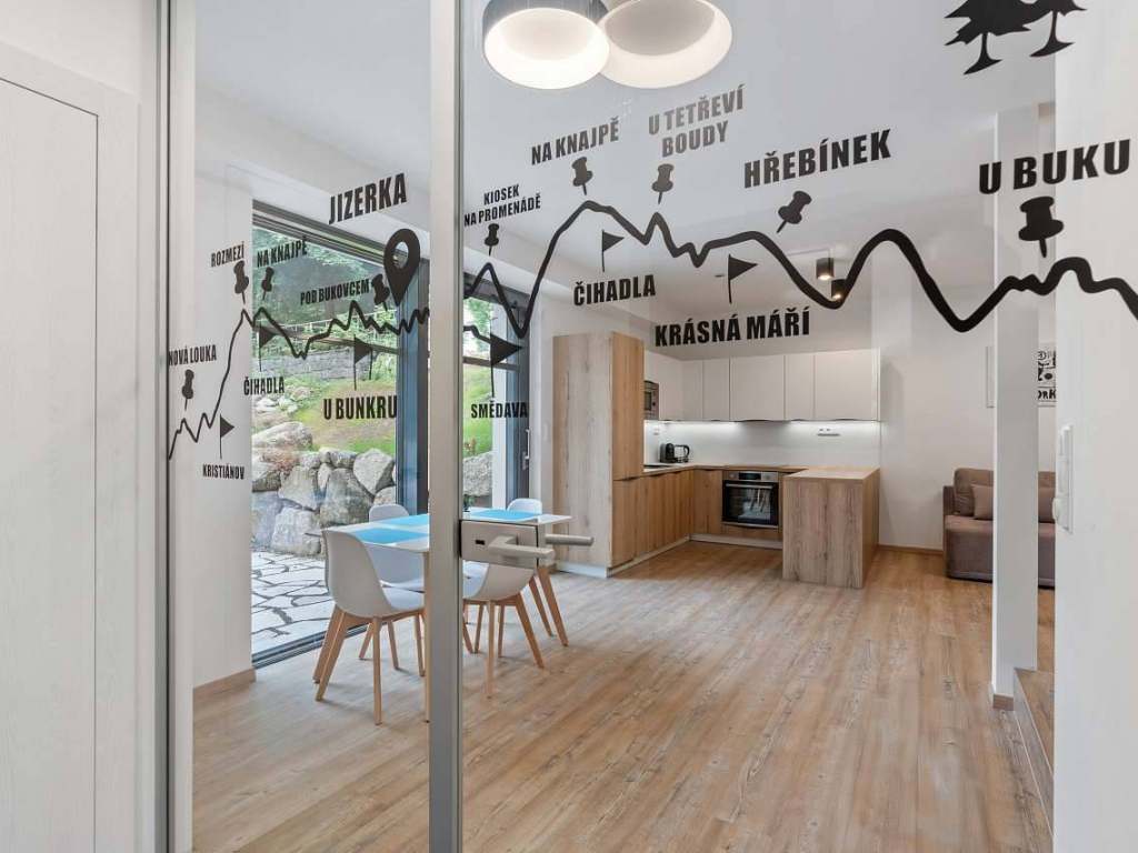 V loftovém dvoupodlažním apartmánu je velký obývací pokoj s kuchyňským koutem, kde si můžete vařit a připravovat jídlo tak, jako ve vlastní kuchyni. K apartmánů náleží vlastní parkovací místo hned u objektu. V okolí jsou lesy, cyklostezky i běžkařské stopy. Lyžařský areál je odtud 10minut pěšky. Potraviny jsou ve vzdálenosti 300m.