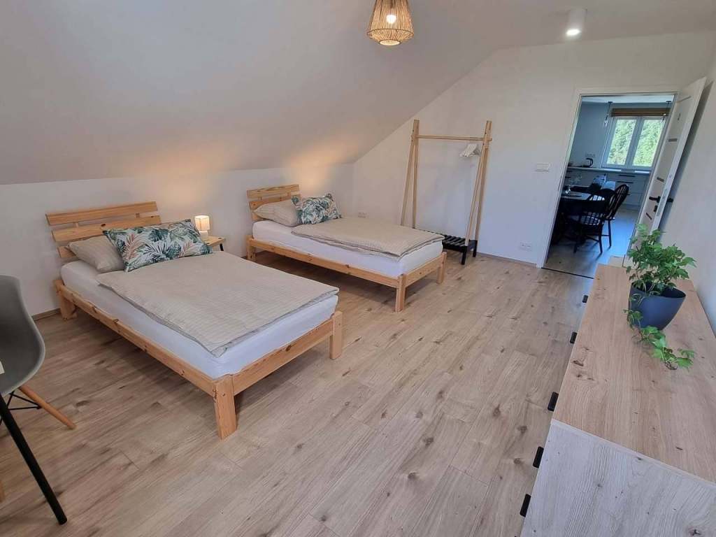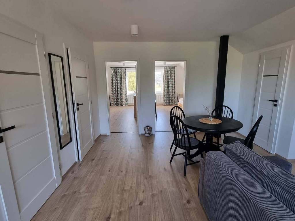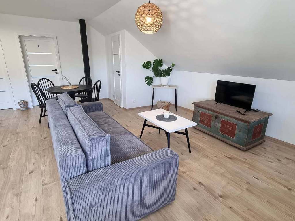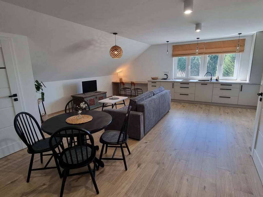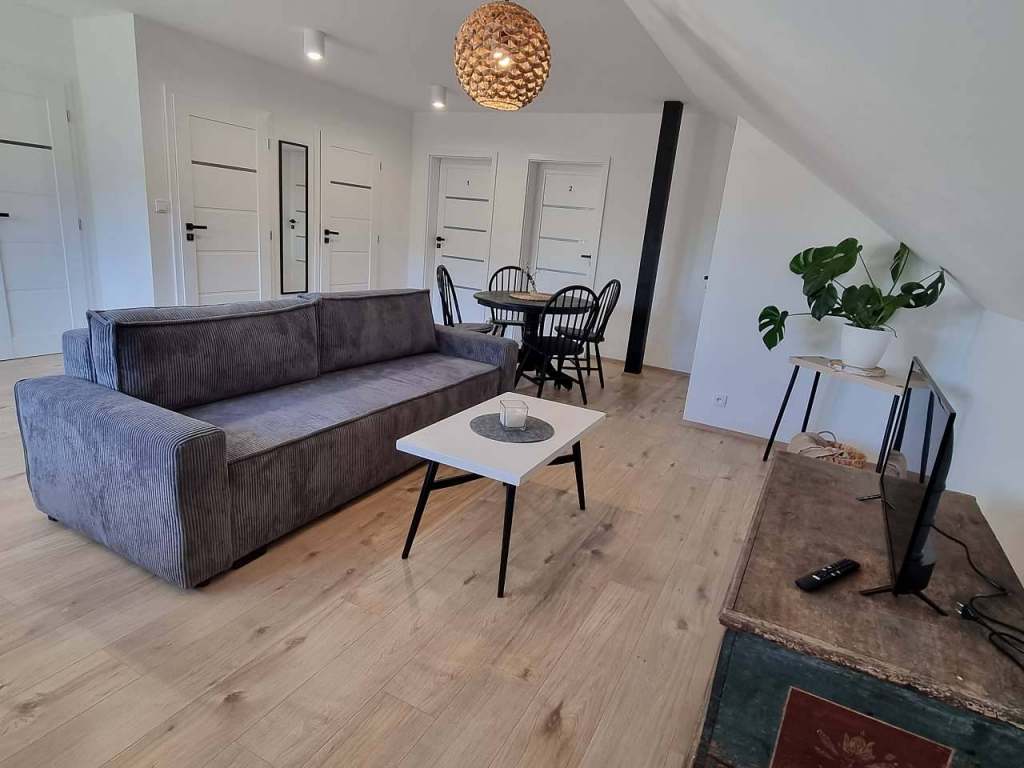K apartmánu vedou schody z vnější strany domu. Po vstupu do předsíně, ze které je přístup i do privátní části domu, vystoupáte po schodech z masivního dřeva do hlavní obývací části, která zahrnuje gauč, televizi, jídelní stůl, pracovní prostor a kuchyňskou linku. Prostor obohacuje originální truhla z roku 1824 nebo školní židličky z bývalé vesnické školy.