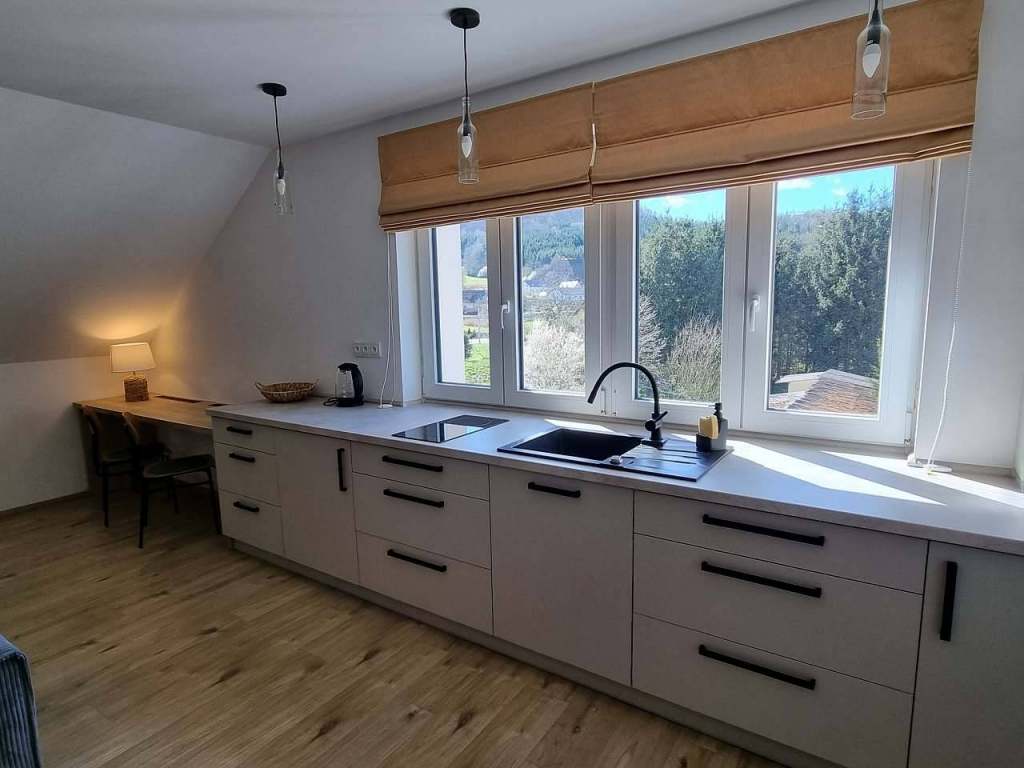 Plně vybavená kuchyně včetně spotřebičů (varná deska, lednice s mrazákem, kávovar).