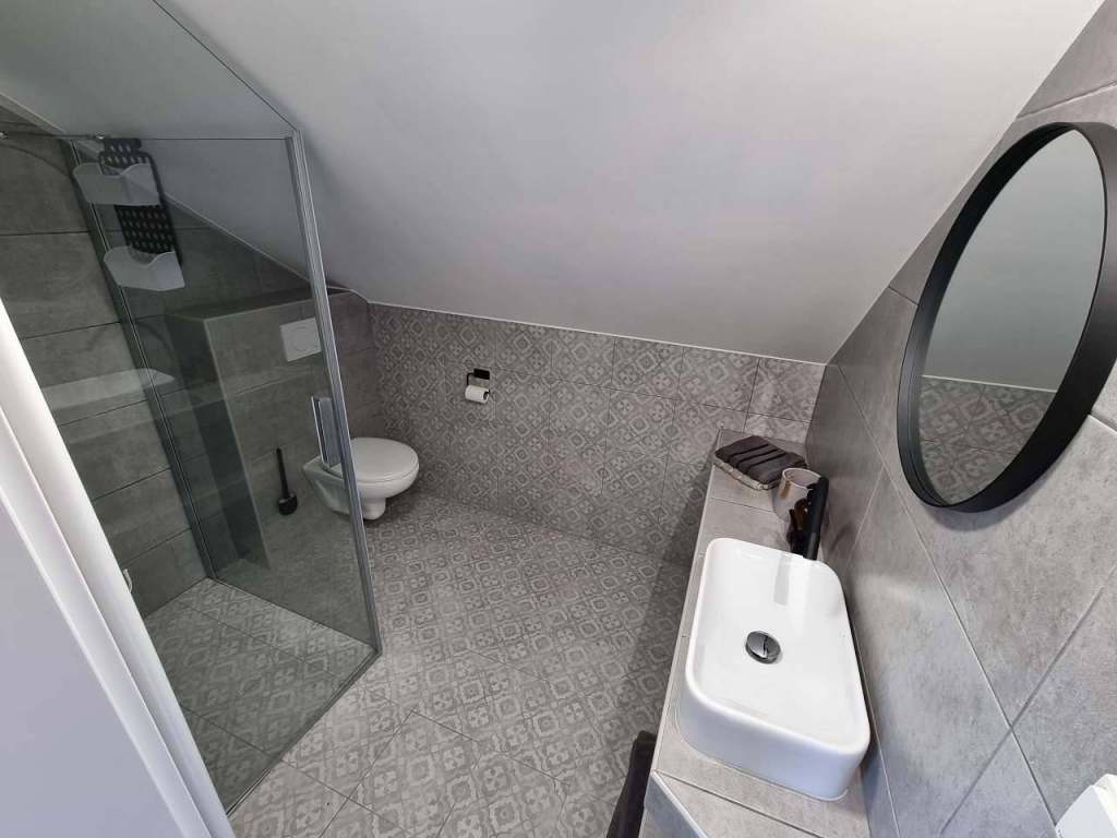 Apartmán se nachází v podkroví, není tedy bezbariérový. V obývací části je umístěn pohodlný gauč, který lze také rozložit i na spaní. Poskytne tak možnost přistýlky pro 1 – 2 hosty. Naproti gauči se nachází internetová televize. Apartmán je vybaven dvěma toaletami. Jedna je samostatná a druhá je součástí koupelny, kde se nachází i sprchový kout.