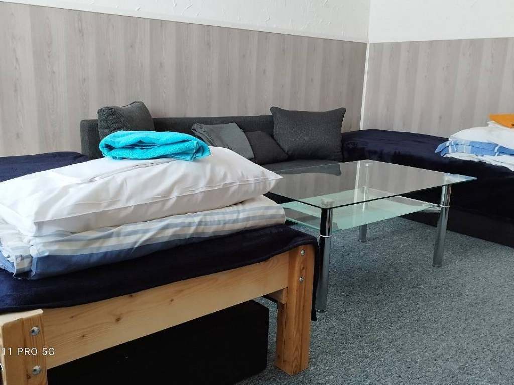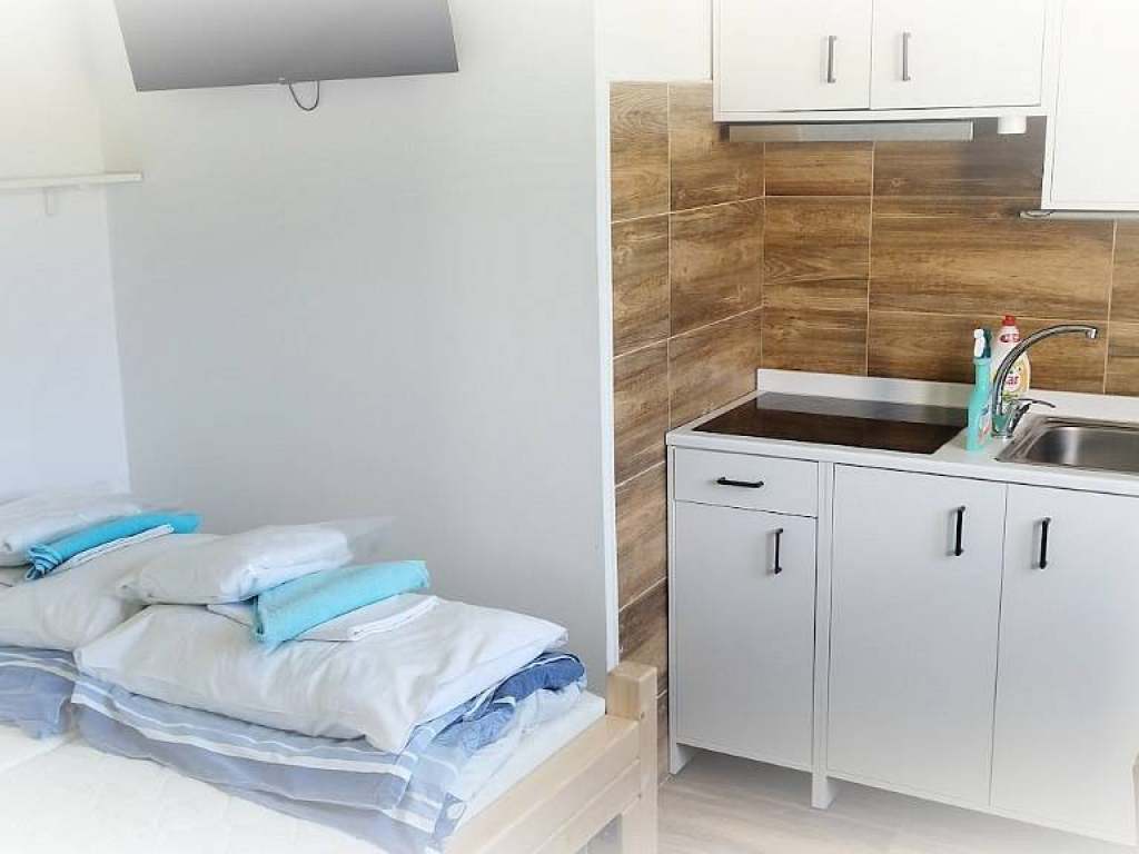 V pokoji jsou povlečená 2 lůžka (povlečení i ručník v ceně) + rozkládací sedačka (pro 2 osoby). Ve druhé časti apartmánu jsou rovněž povlečená 2 lůžka, tam je i vybavený kuchyňský blok z jídelním barem.