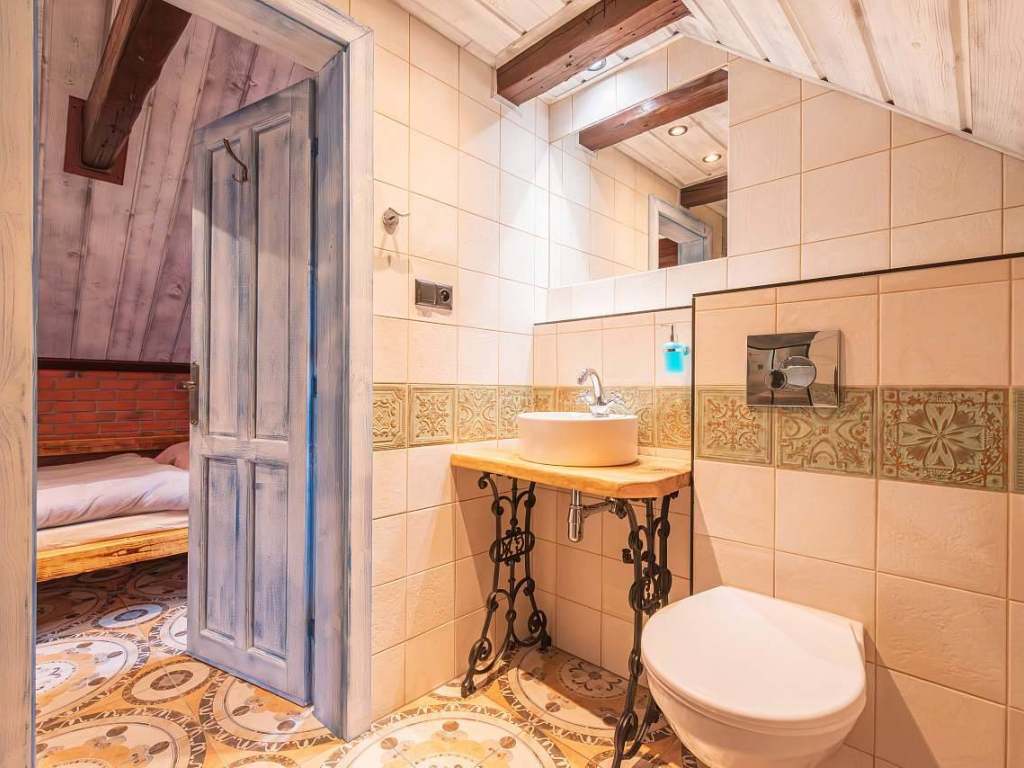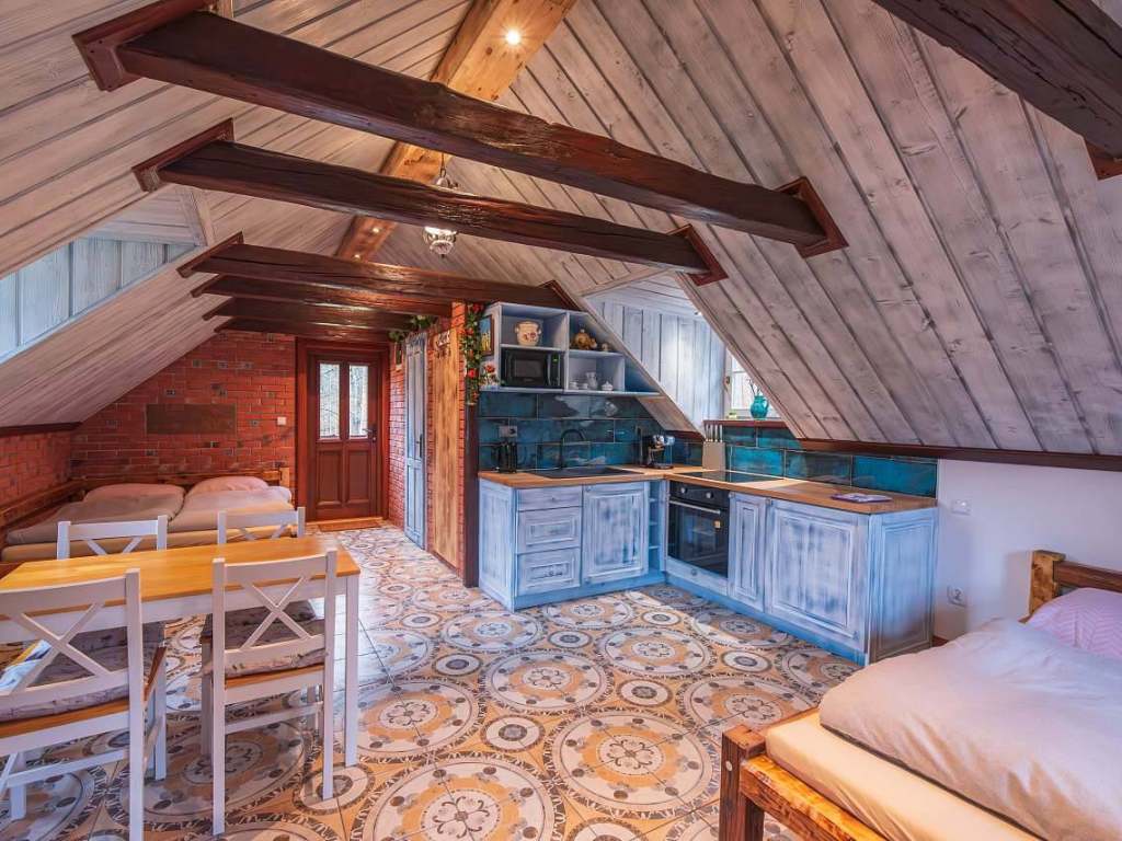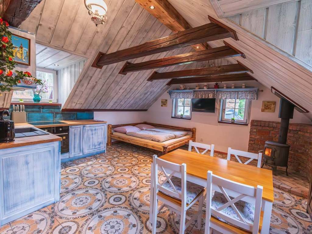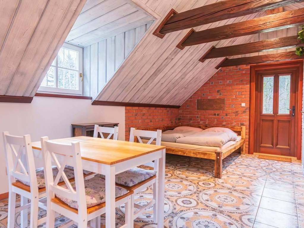Apartmán je pronajímán jako celek, bez ohledu na počet ubytovaných osob. Apartmán je podkrovní a má venkovní vstup po dřevěných schodech. Nachází se zde dvě dvoulůžkové postele, kuchyňská linka s vybavením, krb a koupelna s WC a sprchovým koutem.