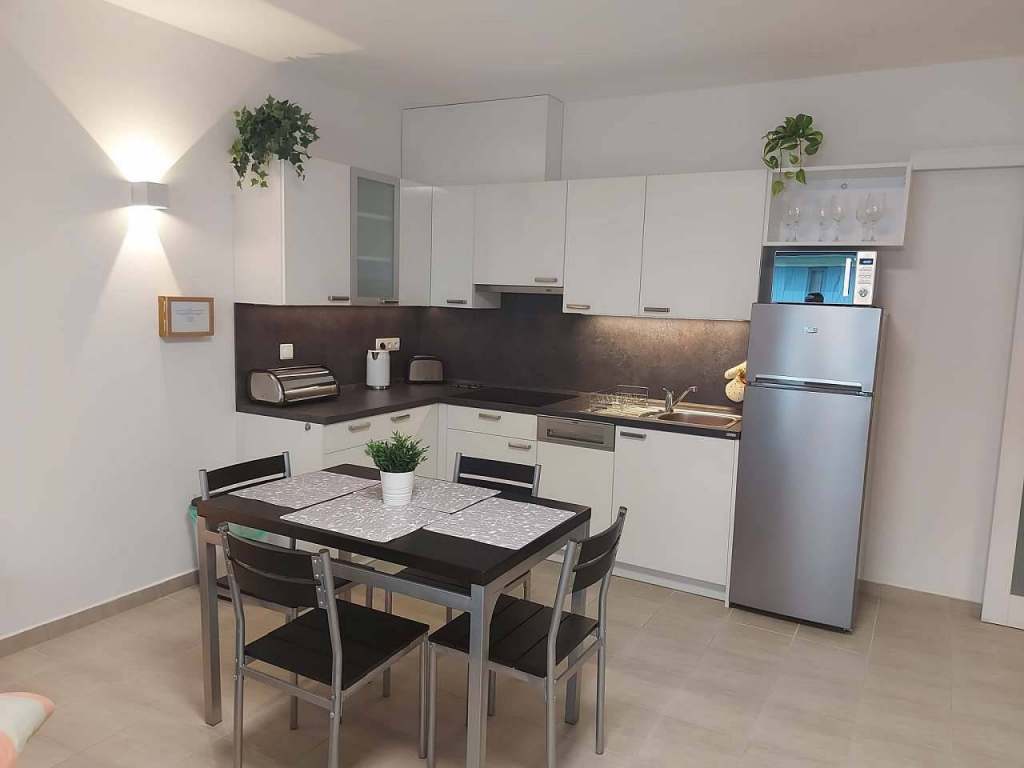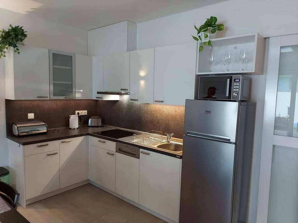 Vybavení apartmánu Lipno s výhledem na jezero: plnohodnotná kuchyňská linka, odpadkový koš, indukční varná deska, digestoř, myčka nádobí, lednice s mrazákem, mikrovlnná trouba, varná konvice, toustovač, chlebovka, veškeré vybavení k vaření, servírování jídel a nápojů k dispozici