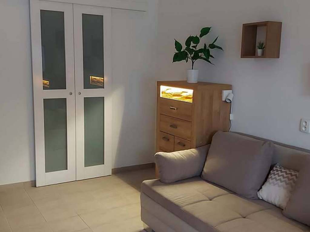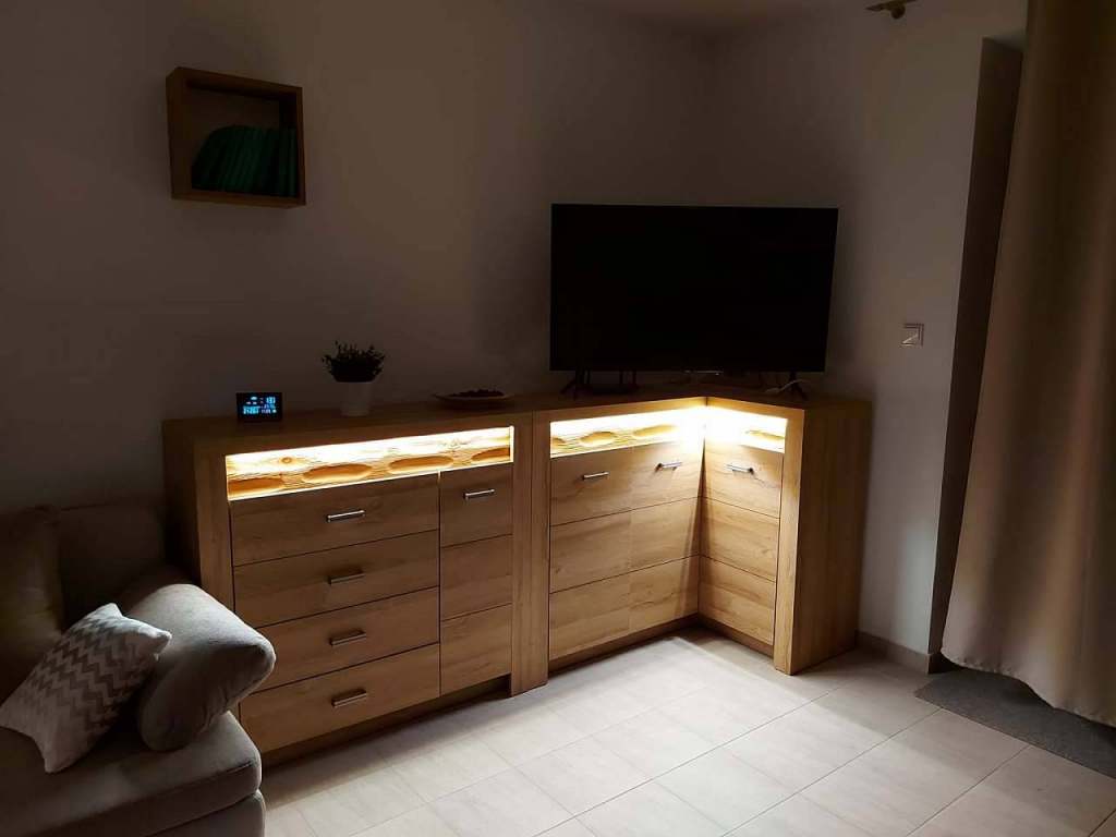 Obývací pokoj 30m² s kuchyňským koutem, jídelním stolem a 4 židlemi, manželská postel 200x180cm s paměťovou matrací Dormeo, 1x rozkládací pohovka s ložnou plochou 200x160cm, veškeré ložní povlečení, komody s velkým úložným prostorem a led osvětlením, francouzské okno