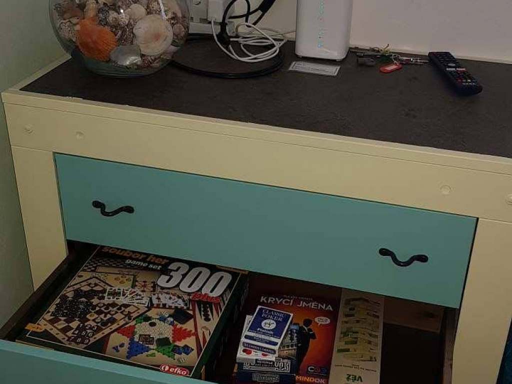 Ložnice s dvojlůžkem, dětský pokoj s patrovou postelí a vysouvacím lůžkem dole - 3 lůžka, obývací pokoj s kuchyní a jídelní částí, kde se nachází dvě rozkládací pohovky, pracovna s pracovním stolem, monitorem a tiskárnou.