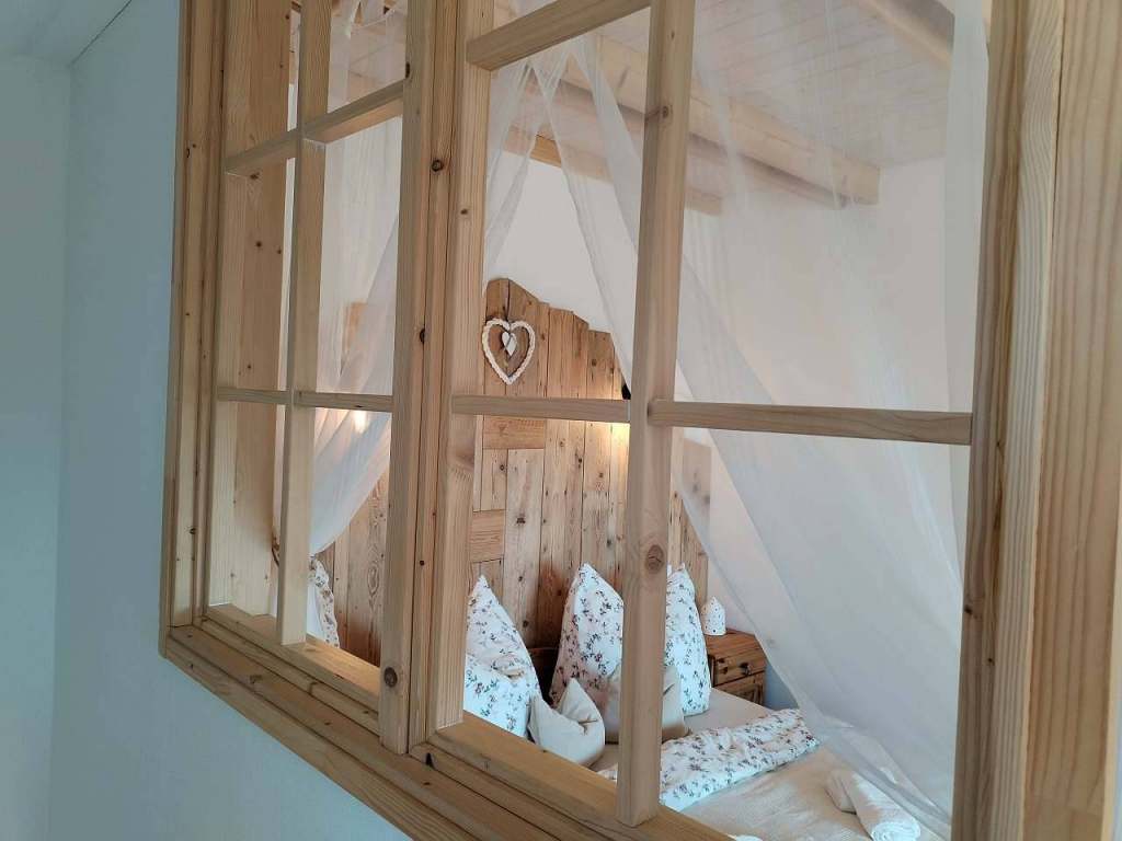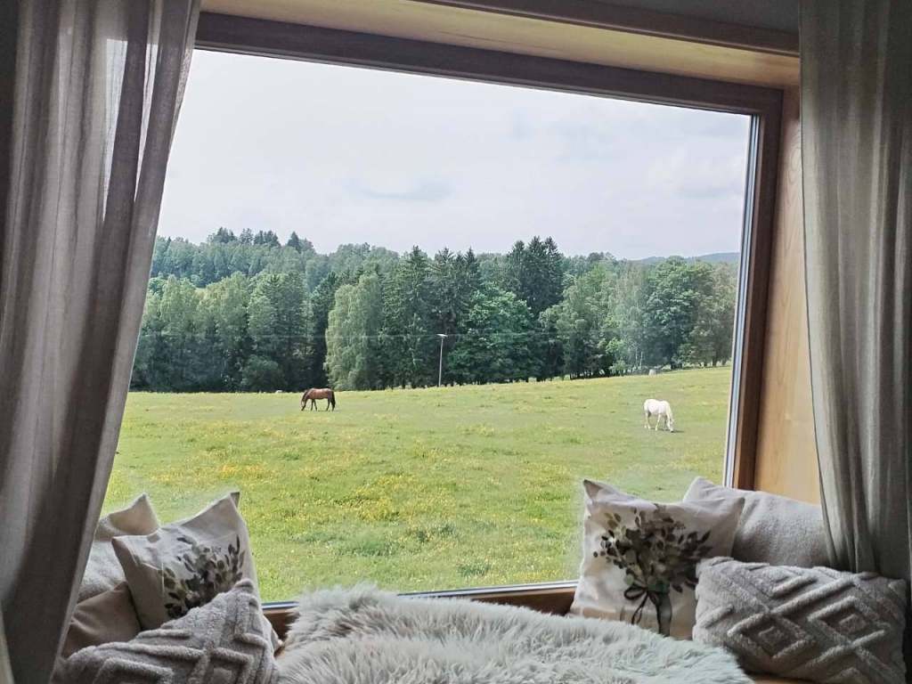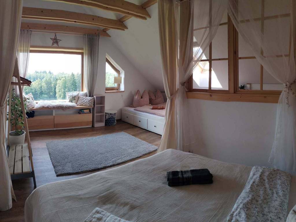 Apartmán má dvě patra. ve spodním patře se hned u vstupu nachází chodba a koupelna. Dále se zde nachází kuchyň spojená s obývacím pokojem, kde se nachází rozkládací sedací souprava. Z kuchyně vede schodiště do druhého patra, kde se nachází ložnice spojená s menším obývacím pokojem. Mezi patry nejsou žádné dveře. V horním patře se nachází velký prostor kde je manželská postel, kde se dá zatáhnout závěs a v rohu je rozkládací postel, ze které se dá udělat letiště. V horním patře máte možnost se zrelaxovat v sedacím okně a pozorovat pasoucí se koně a nádherné západy slunce. V kuchyni je vše potřebné k vaření, nechybí zde ani základní koření a nádobí. Jelikož bydlíme hned vedle, jsme Vám kdykoliv s čímkoliv nápomocni. Na apartmánu samozřejmě nechybí ani povlečení, ručníky, osušky, v koupelně fén a mýdlo. Nemusíte vozit nic navíc jen své osobní věci. Zvířecí mazličci jsou povoleni za poplatek 1 - 2 250kc za noc, dalsi kazda noc za 100kc. Sledujte naše FB stránky Apartmán Schwaderbach budou tam různé akce a last minute.