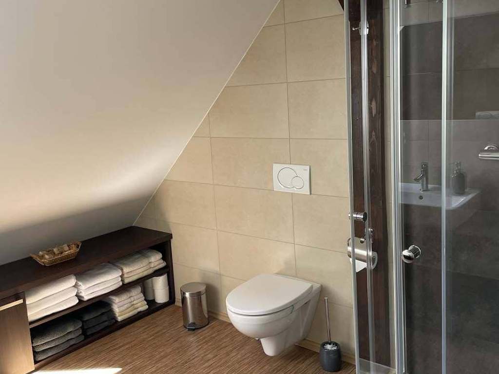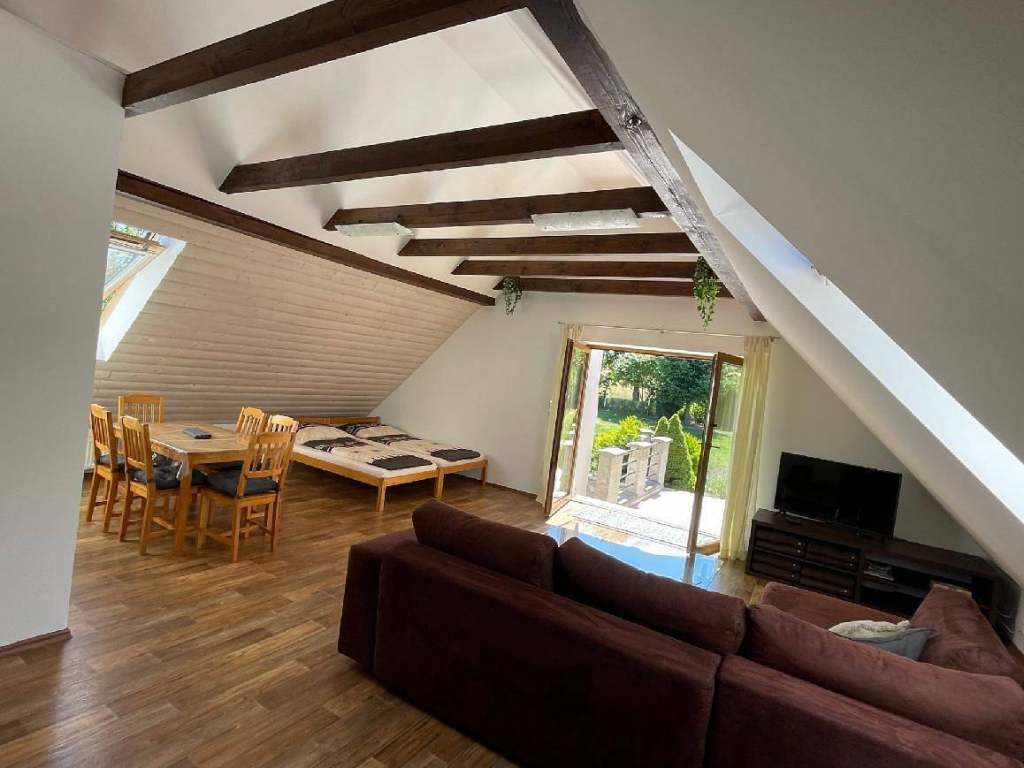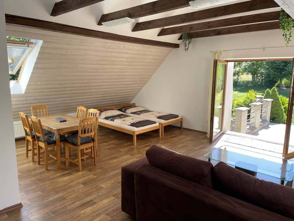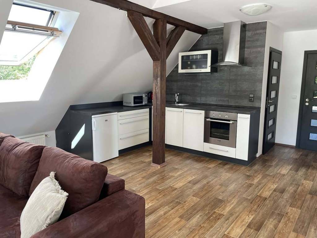 Podkrovní apartmán o velikosti 105m² poskytuje obývací prostor se sedací soupravou, dvoulůžkem, jídelním stolem a TV. Součástí obývacího prostoru je plně vybavená kuchyňská linka s lednicí, sklokeramickou varnou deskou, horkovzdušnou troubou, mikrovlnnou troubou a rychlovarnou konvicí.