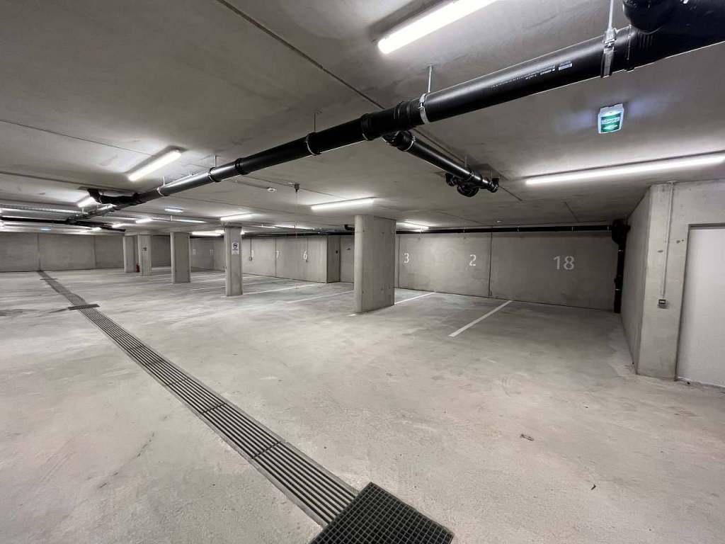 K apartmánu přísluší jedno garážové stání uvnitř objektu (cca 2,45 x 5,00m). Vjezd je možný vraty šířky 3,5m se světlou výškou 2,28m (zaparkovalo zde SUV s rakvičkou i minivan bez rakvičky).