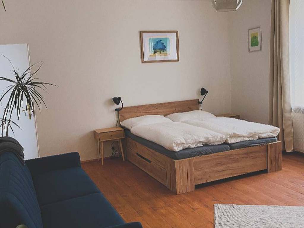 Očekávejte dřevěné podlahy, nový i upcyklovaný nábytek a obrazy českých umělců. Rádi vám poskytneme Croozer vozík za kolo.