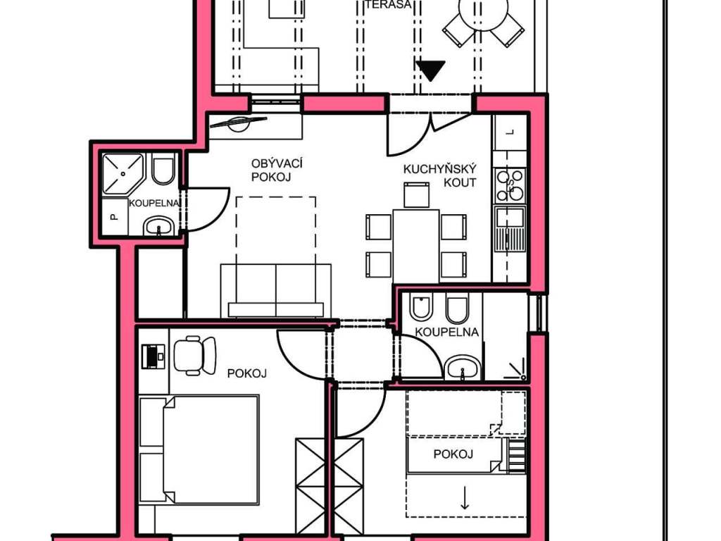 Dále jsou zde 2 koupelny, obývací pokoj s rozkládacím gaučem a obrazovkou + vybavený kuchyňský kout.
