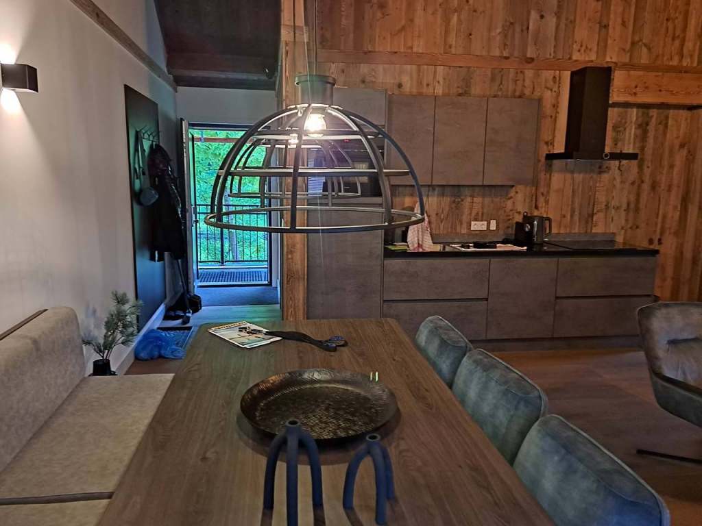 Kuchyň je vybavena - varnou indukční deskou, multifunkční mikrovlnou troubou s troubou pro pečení. Lednicí, myčkou a kávovarem. Dostatečným počtem nádobí. Obývací pokoj s kuchyňským koutem. Velký jídelní stůl, pro Vaše stolování. Konferenční stolek pro Vaší pohodu. Pohodlný gauč a křeslo.