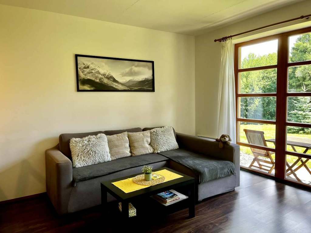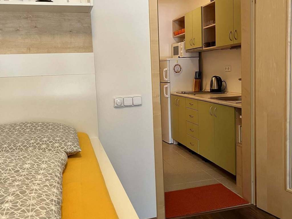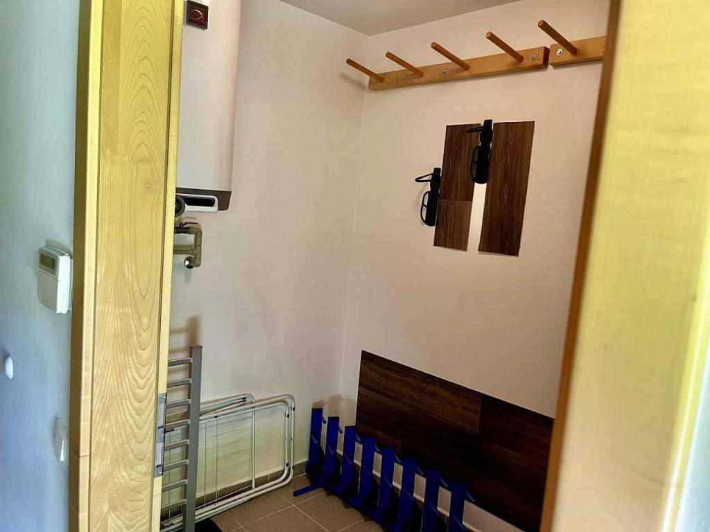 Apartmán je umístěn v přízemí a najdete v něm předsíň, sušárnu, sociální zařízení, kuchyň a obývací pokoj společně s ložnicí.