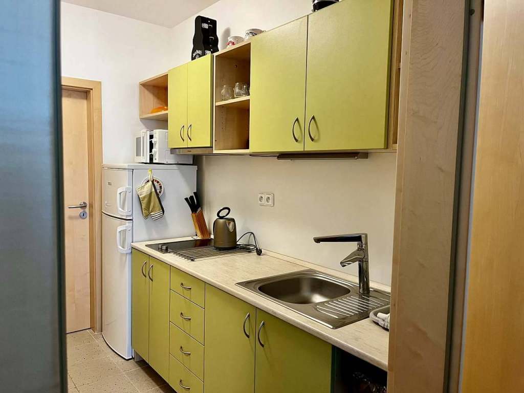 Kuchyň: V kuchyni naleznete veškeré potřebné vybavení pro přípravu a konzumaci jídla. Nachází se zde sklokeramická varná deska se 2 varnými zónami, lednice s mrazákem, mikrovlnná trouba a rychlovarná konvice.