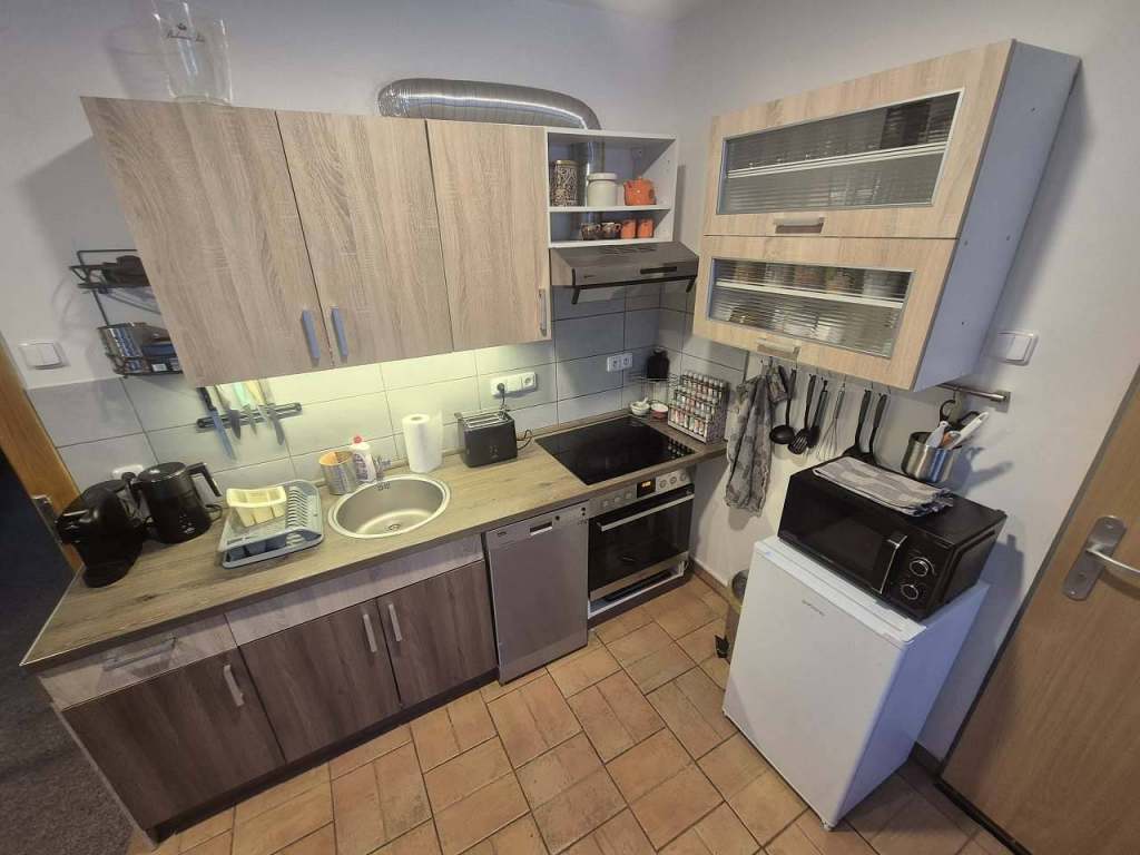 Kuchyň je plně vybavená (Lednice, myčka, mikrovlnka, trouba, sklokeramická deska. digestoř. kávovar. toustovač, rychlovarná konvice, parní hrnec) k dispozici spousty koření a vybavení ke stolování pro deti i dospělé.