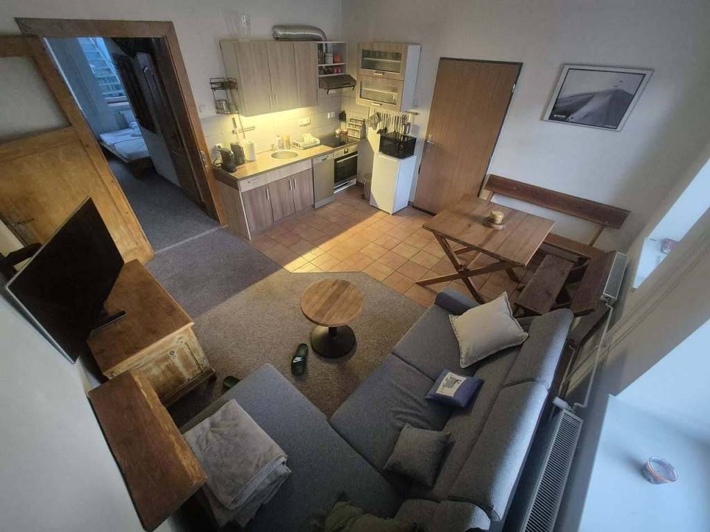 Apartmán Niky 3+kk v Jáchymově po rekonstrukci. V přízemí velká místnost s kuchyní, jídelním stolem a velkým gaučem. Zde si i zapálíte oheň v krbových kamnech.... zobrazit detail