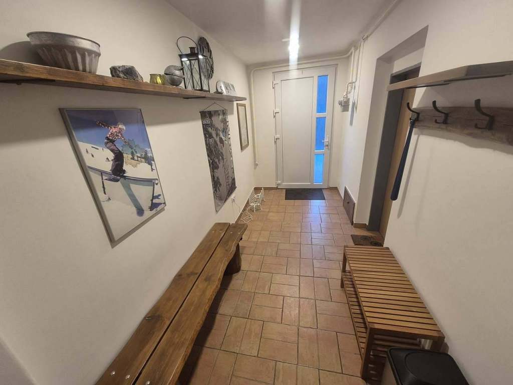 Po vstupu do domu vás přivítá velká vstupní hala s věšáky a lavicí pro obuv a přezouvání.