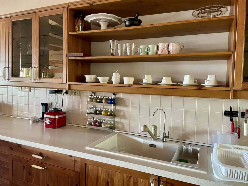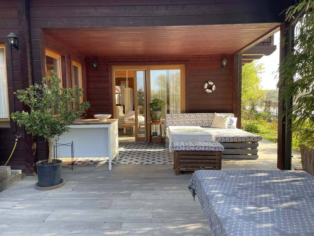 Kuchyň je vybavená novou troubou, mikrovlnkou, americkou lednicí s mrazákem, kávovarem, kvalitním nádobím. Kolem stolu se pohodlně usadí 6 lidí. K dispozici je dětská stolička. Pro nechodící batolata je připravený prostor s kobercem s vysokým chlupem. Ve stropě jsou úchyty na dětskou nebo dospělou houpačku. Relaxovat u televize můžete na zavěšené houpací posteli. Dále je v obývacím prostoru pohovka, ušák, podnožka a konferenční stolek. Spaní je připravené v centrální místnosti na dvojlůžku a v dětské mini ložničce U medvídků. Dále jsou zde skříně na oblečení (5x 50cm šíře) a knihovny s beletrií a knížkami pro děti. Pračka stojí v technické místnosti, klíče na požádání u majitele. Sauna, vířivka, gril k dispozici po dohodě. Dominantou apartmánu jsou kachlová kamna. Na obytnou část navazuje krytá terasa s pohodlným nábytkem. Ta plynule přechází v zahradu. U vody stojí altán, sauna, molo.