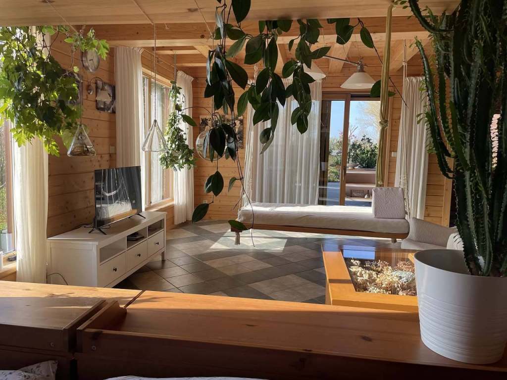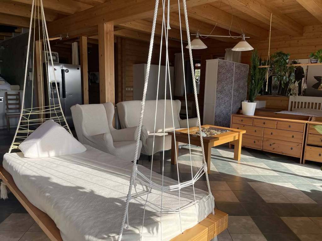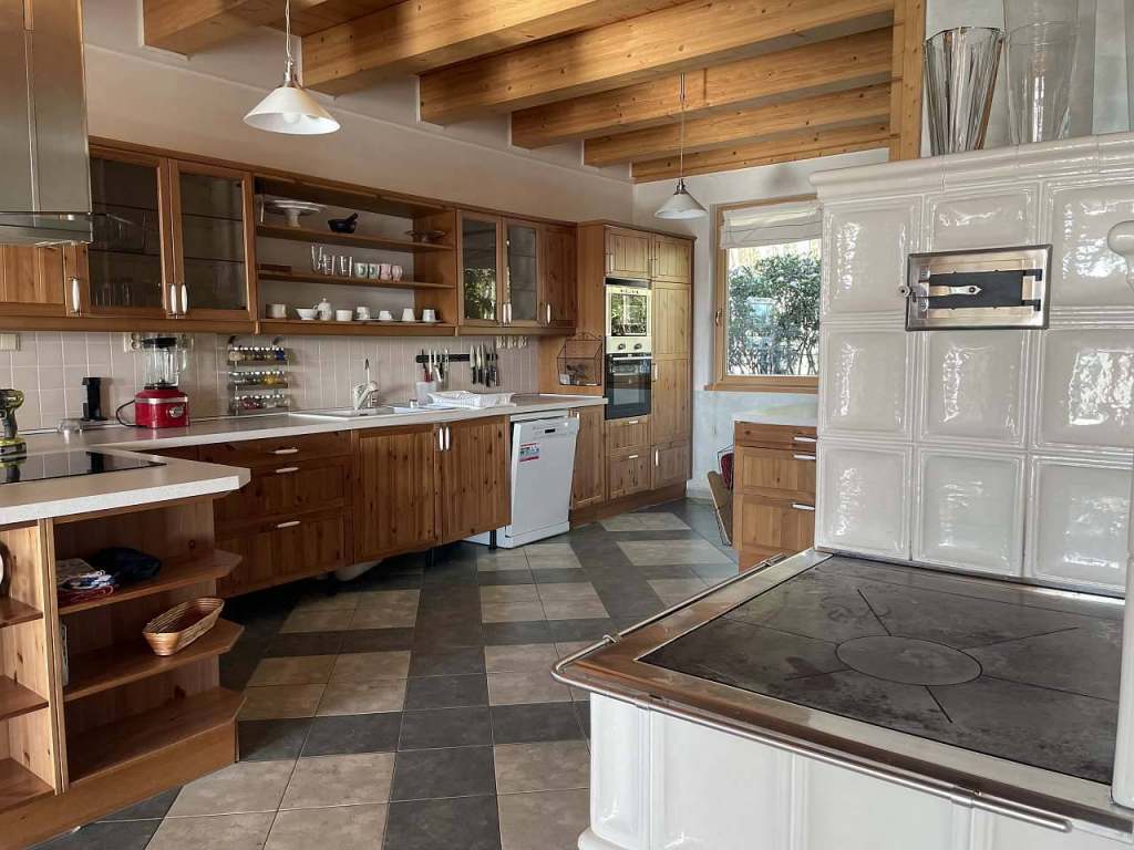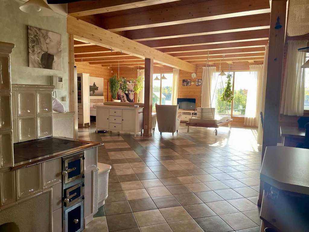Jedná se o přízemí (cca 90m² otevřeného prostoru, který zahrnuje velkorysou kuchyň s americkou lednicí a kachlovou pecí se zápecím, jídelní kout, TV prostor s houpací postelí, spací koutek a medvídkovou ložničku pro děti.