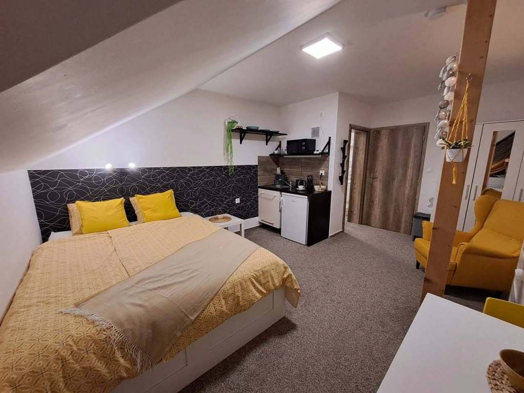 Obytná místnost s kuchyňským koutem a samostatnou koupelnou. Kapacita 2 dospělí a možnost postýlky pro dítě do 3 let.
