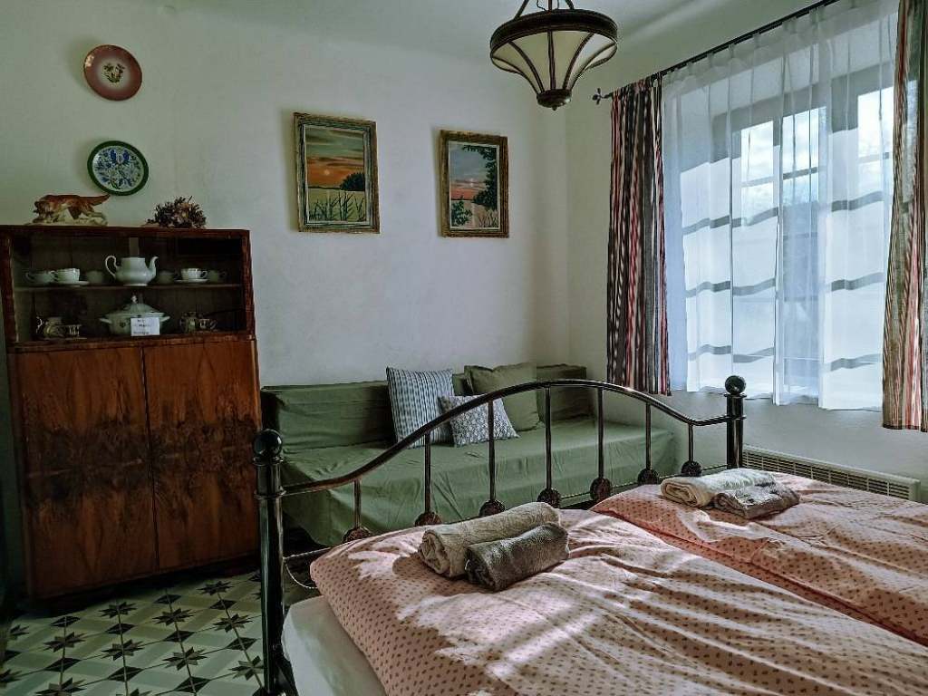 Pokoj 1: manželská postel 200x200 + rozkládací pohovka 120x190 pro 2 děti nebo jednoho dospělého, vlastní koupelna