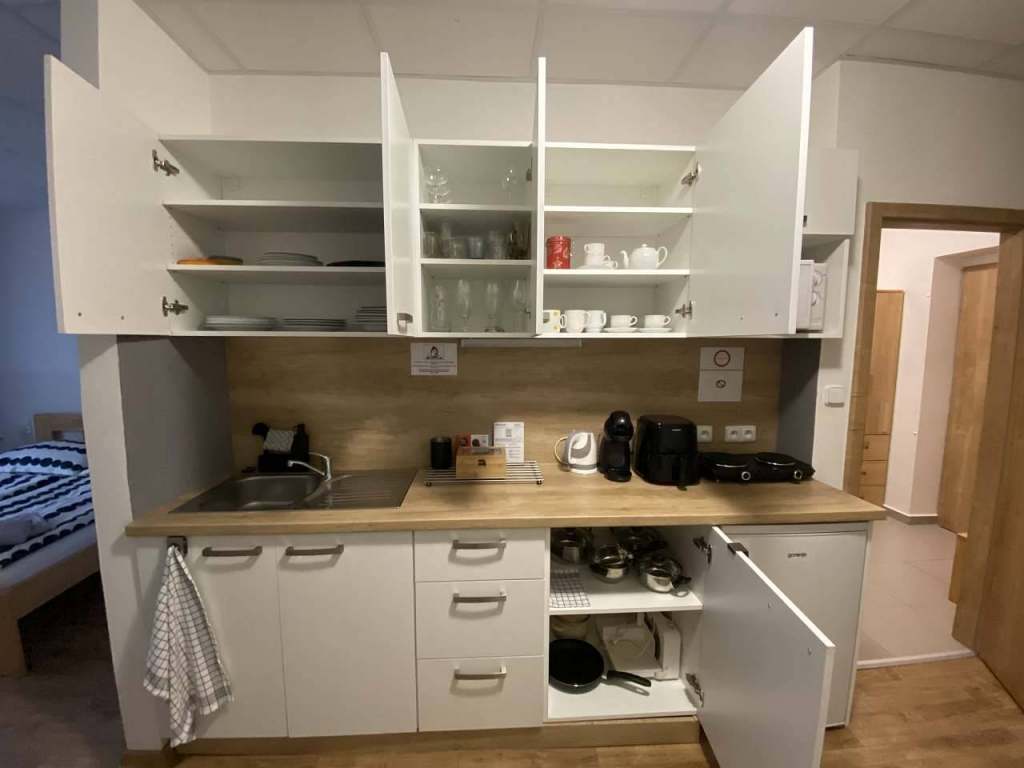 Apartmán nabízí vše potřebné pro přípravu vlastní stravy. Součástí je kuchyňská linka, lednička, mikrovlnná trouba, elektrický dvou plotýnkový vařič, rychlovarná konvice, automatický kávovar na kapsle Dolce Gusto, horkovzdušná fritéza, elektrický kráječ na pečivo, sadu nádobí k přípravě pokrmů, pánev. Koš na odpadky, TV, Wi - Fi router, vnitřní žaluzie, závěsy, záclony, stůl a 4 židle, manželskou postel (200/200cm) s nočními stolky a lampičkami, palandy (180/90cm). Po domluvě je možné přidat také dětskou postýlku (120/60cm), kterou lze umístit v bezprostřední blízkosti manželské postele. V předsíni je umístěna skříň na šaty a odkládací lavice na zavazadla, dále stěna se zrcadlem a také stěna na šaty a lavička. Podlahy v koupelně, předsíni a na terase je obložena dlaždicemi. Ostatní podlaha je vinylová s dekorem dřeva. Na terase jsou dvě židle a odkládací stolek. K apartmánu náleží sklepní kóje, kterou lze využít k uskladnění lyží, snowboardů, kol, koloběžek či kolečkových bruslí. V lyžařské sezóně je v objektu k dispozici nástěnný vysoušeč bot a rukavic. Venku lze využít společné ohniště, gril, altán, dětské pískoviště, trampolínu a velkou oplocenou travnatou plochu. Deskové hry.