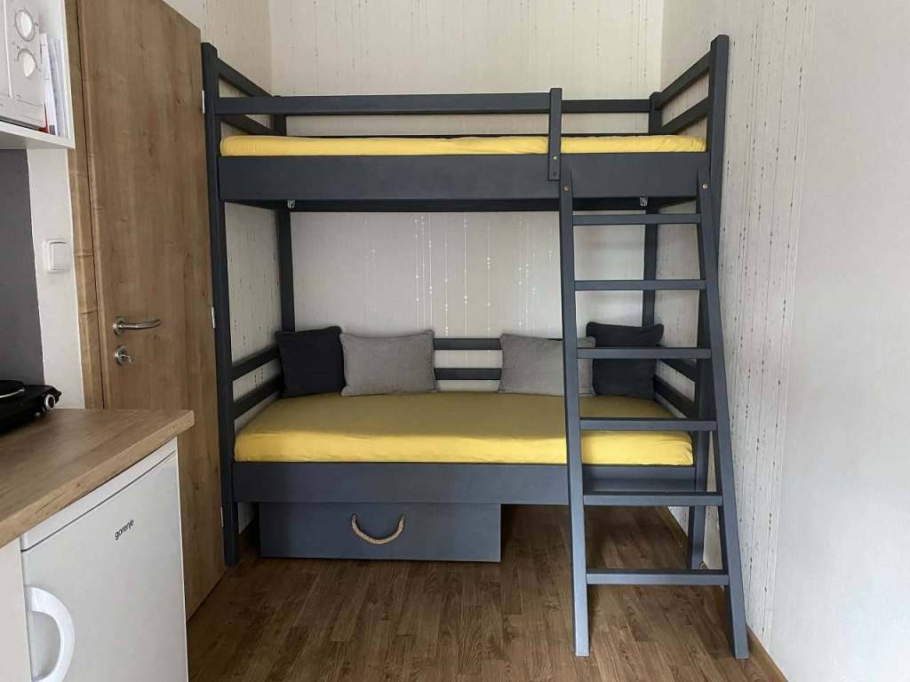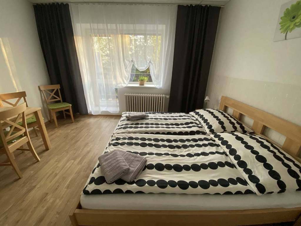 V apartmánu šumavská „8“ se nachází dvoulůžko (200 cm x 200 cm) v obývacím prostoru, který je spojený s kuchyní a ložnice s palandou (180 cm x 90 cm).