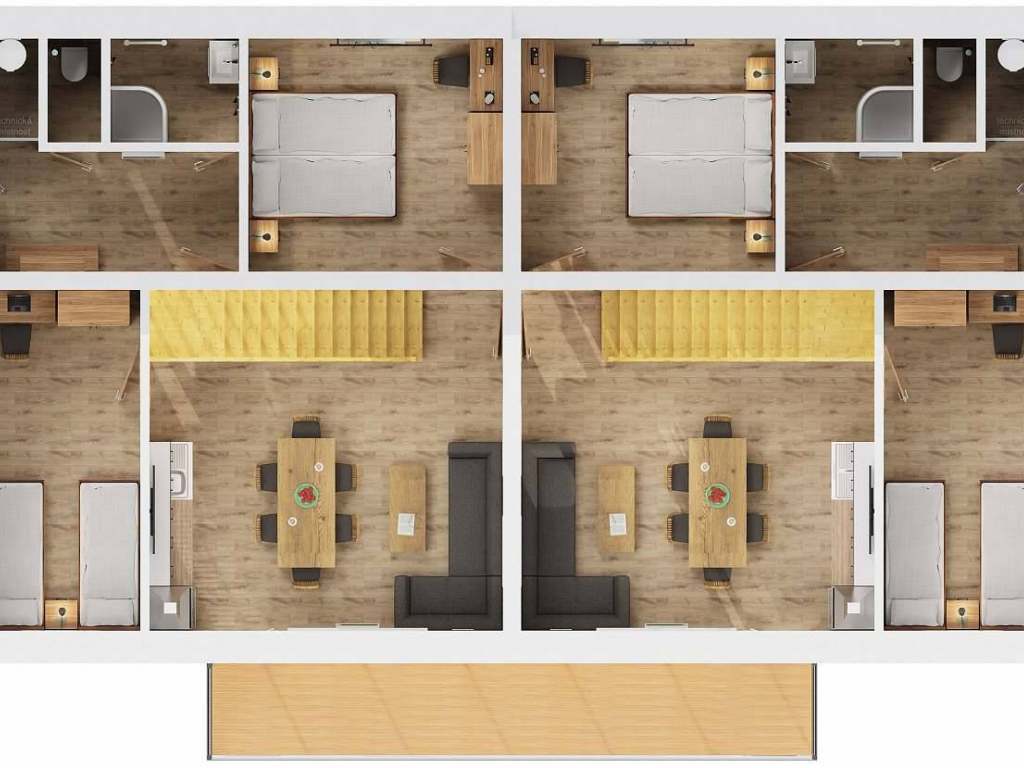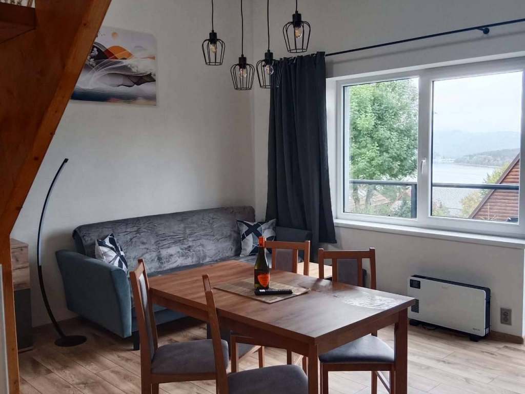 Apartmány v horním patře novostavby dvojchaty (celkem 4 apartmány) o celkové ploše jednoho 63 m2 disponují každý kromě koupelny se sprchovým koutem a samostatným WC také dvěma ložnicemi, obývákem s kuchyňskou linkou a horním podkrovím se třemi dalšími lůžky a útulným sezením s hracím koutkem pro děti. Vše v plné výbavě zdarma! Ubytování podtrhuje velký balkon s překrásným výhledem na Lipenskou přehradu. Apartmán se nachází v nejvyšším bodě na Kobylnici v klidné chatové oblasti, kde nebudete ničím a nikým rušeni!