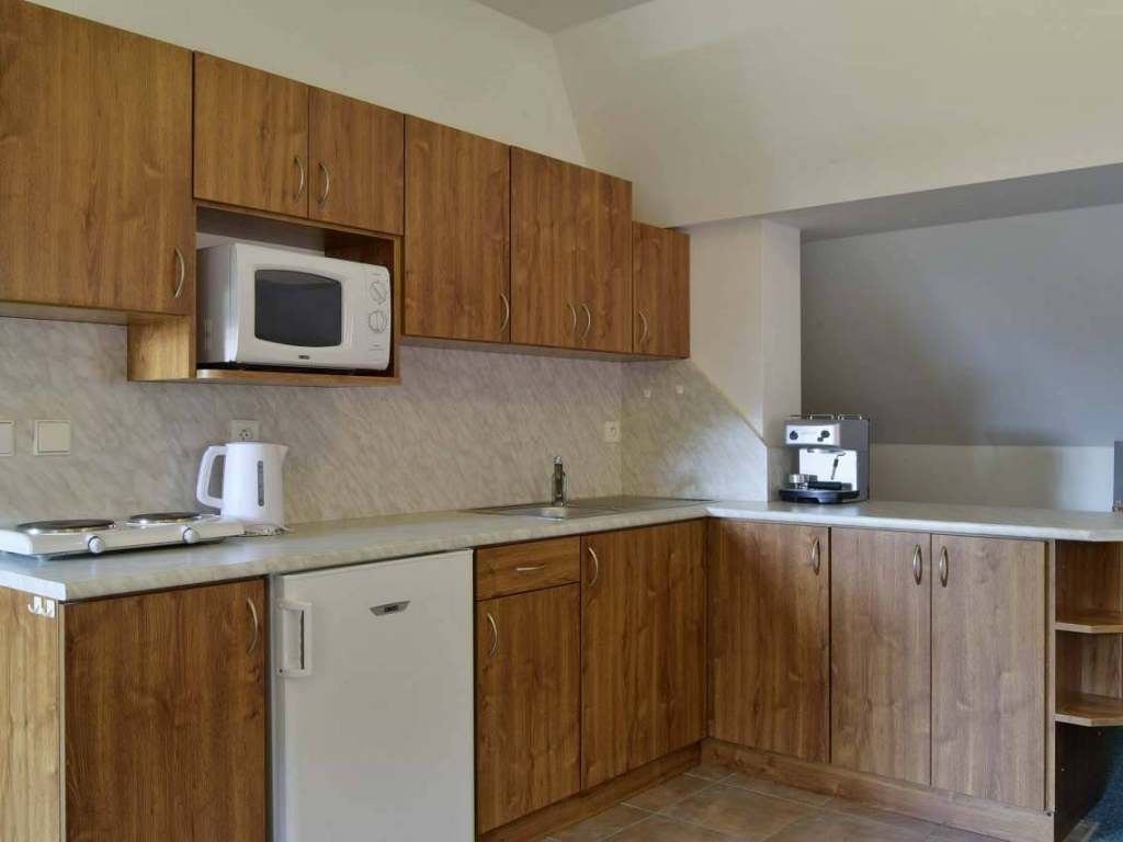 V každém apartmánu je k dispozici plně vybavená kuchyň, doplněna o spotřebiče jako varná konvice, mikrovlnná trouba a dvouplotýnkový vařič, velká elektrická pečící pánev a zapékací toaster. V kuchyňské lince je i kompletní servis v podobě hrnců, pánviček, talířů a příborů. Jídlo si můžete umístit do prostorné lednice.