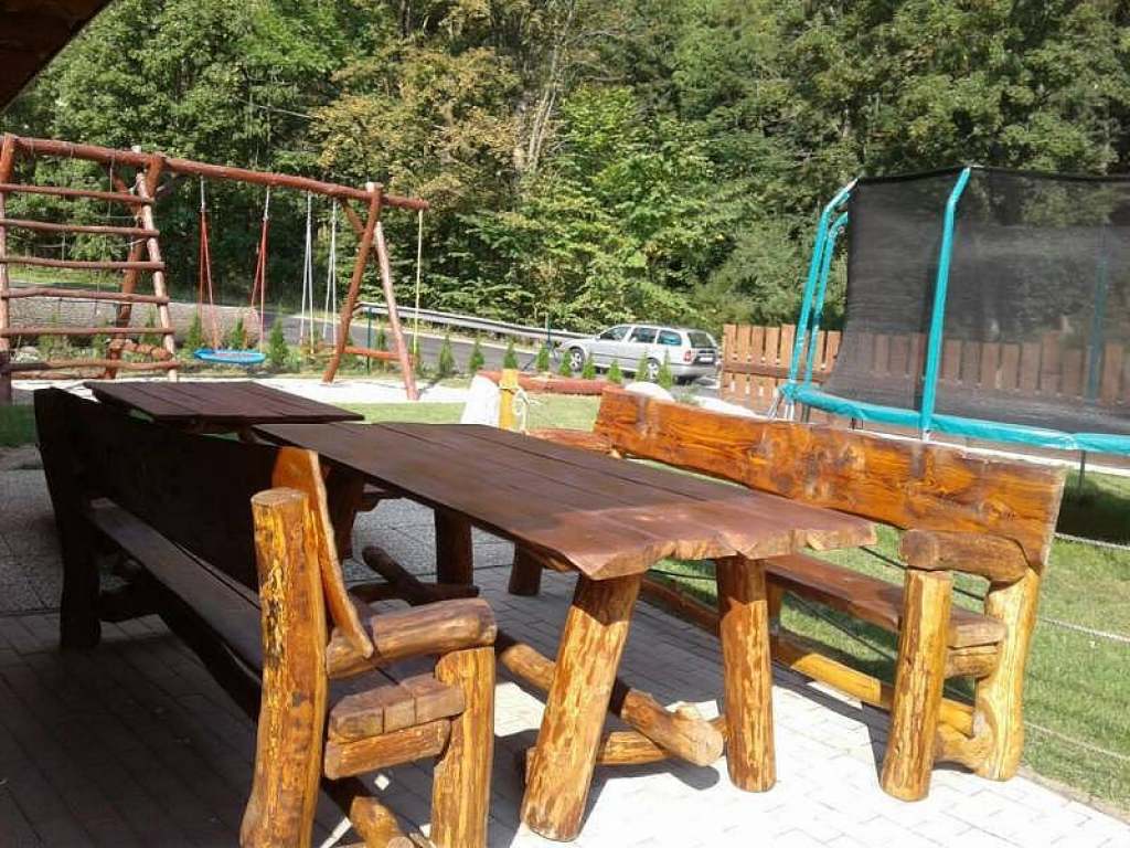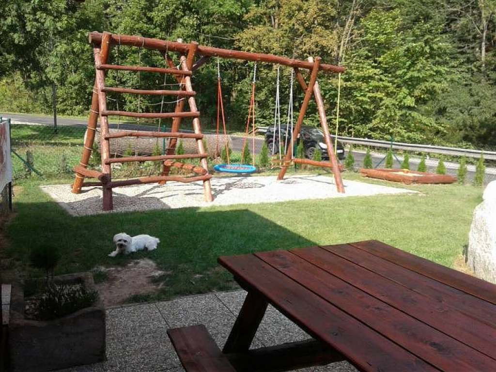 Na oplocené zahradě je umístěna pergola s krbem a udírnou, je zde i vyžití pro děti - dětské hřiště, pískoviště, houpačky.